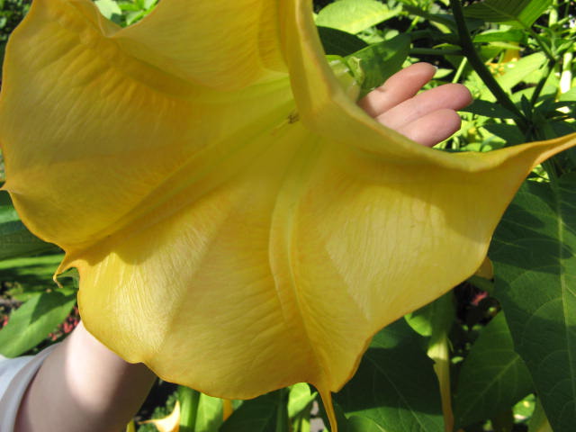 I'm pretty sure that is a Datura, Slick, or what we call an Angel Trumpet, but I'm going to ask my plant experts and find out. I cannot believe the size of that bloom!!!!! Wow! I have never seen an Angel Trumpet with that sized bloom.