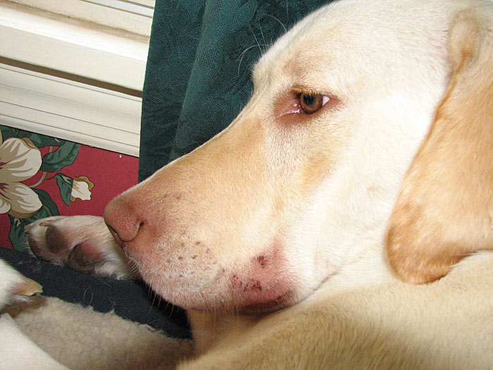 Has anyone ever had an allergy test performed on their dog? I've got one set up tomorrow for Nova. Her allergies are just getting out of control lately. I'm not sure if she's allergic to a certain meat, or if it's seasonal, or what. But she's just so uncomfortable and she's always itching. She has constant ear infections and rashes, but her face is what's really bothering her right now. It's getting all scabby and she's losing hair. Take a look ...