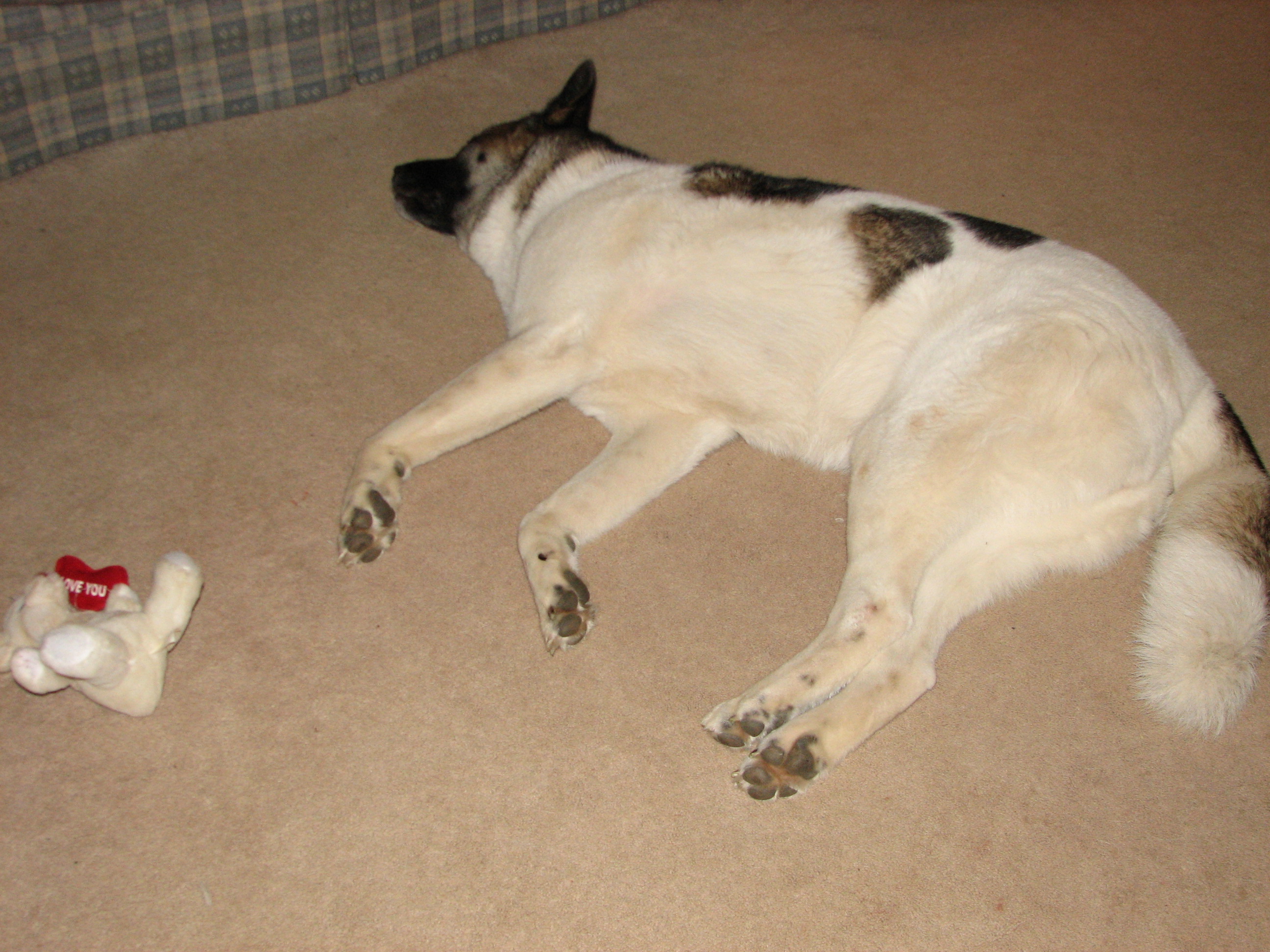 Adele is on the floor licking/chewing her feet & nails (a weird habit of her's, she doesn't hurt herself), Marta and Vallis are outside barking at something. ...wait, I mean "being good watchdogs."