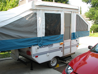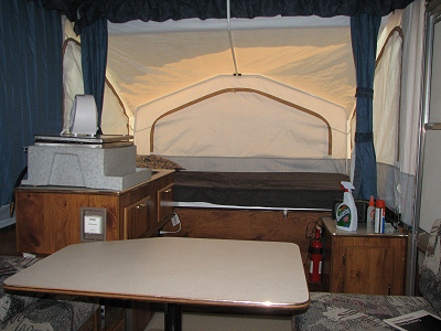 It has an AC unit, stove, beds, sink, table (the third bed turns into a table.) It's really very nice. Simba loves it.We're hauling it with my dad's Chevy Truck... I believe a Silverado?
