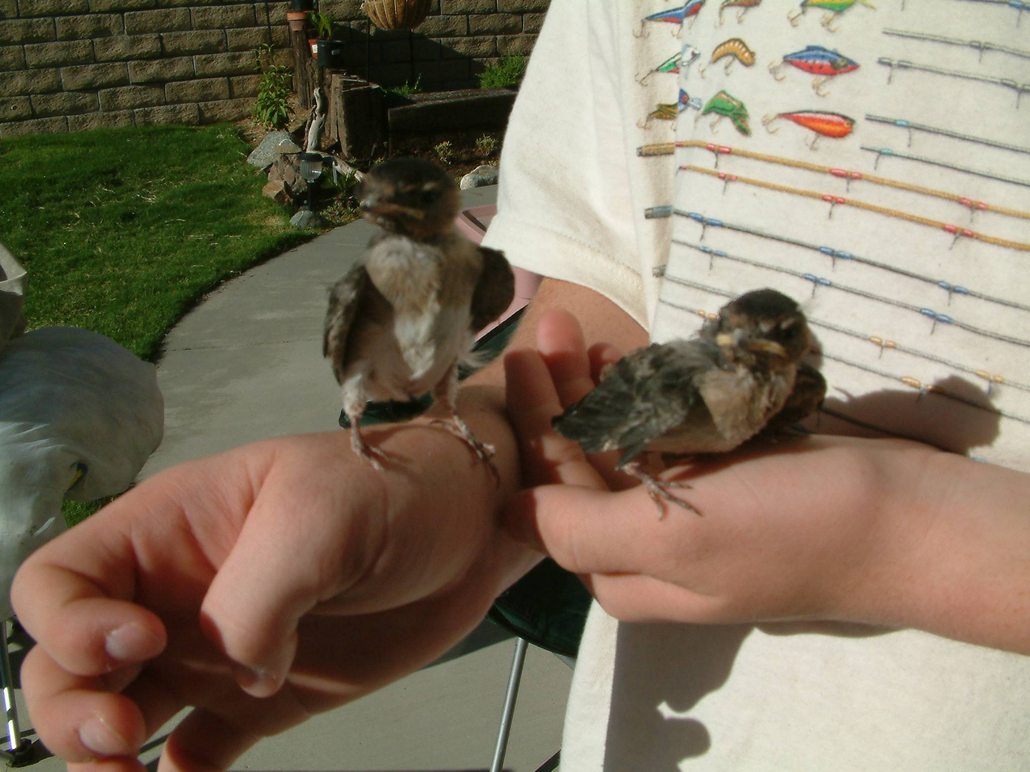 We have had two more swallow chicks fall into our yard. This time the colony immediately began to feed them, so we kept them outside in a shaded area on an open stand, covering them them at night with a cage to protect them. The first chick quickly developed his flight feathers and within a few days flew the coop. The 2nd is lame like Fred. He has not completely grown all his feathers yet. The colony continues to feed him, but we give him water (it's been very hot). Picture 1 shows the injured swallow in my nephew's left hand.