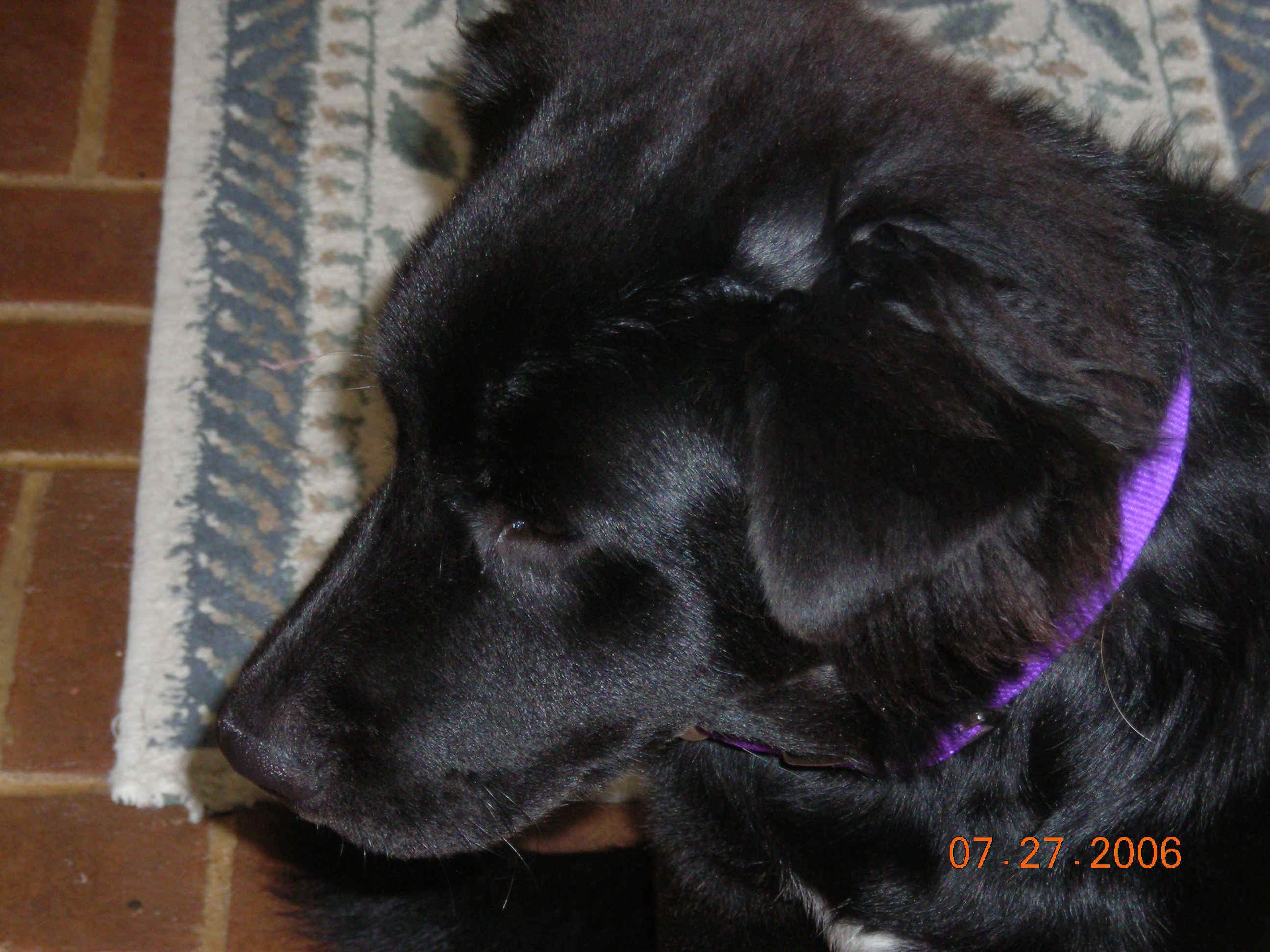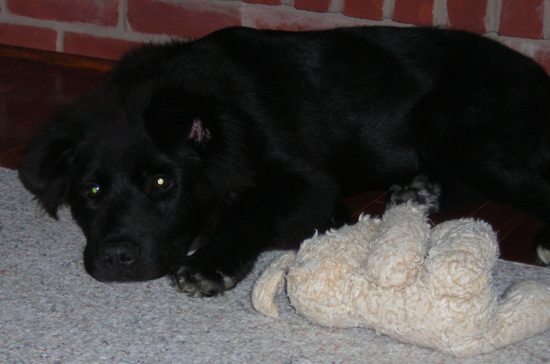 Hi - I just adopted a 5 month old puppy. I was told at the shelter he is a Lab/Chow mix. But I have a 5 year old Lab/Chow mix & he has the purple tongue. This new puppy does not. He has a very pink tongue. His body has flat wavy hair - but his head has what we call an afro and it has a curl to it. He also has a little white on his chest & toes. I am thinking Lab/Newfoundland mix. He has big feet & at 5 months weighs in at 40 pounds.