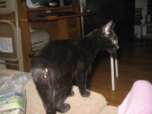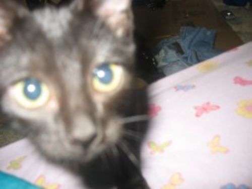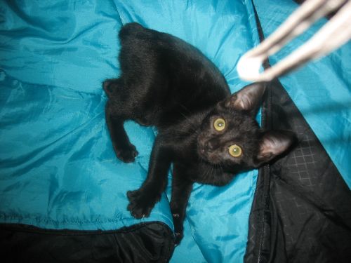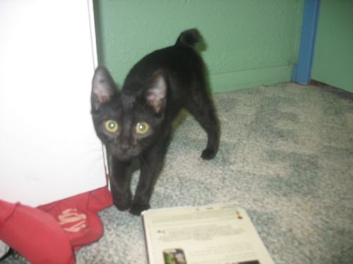 My sister found a kitten by Albertsons while with my aunt. My aunt let her take it and the little kitten was living in the bathroom for a day or two. She's a black Mynx. Then Ashley (my sister) took it home and how she's here! We're calling her Black Kitty. She's going to one of my sister's friend's tommorow. But for the night, she's in my sister's room. Here are some pictures!