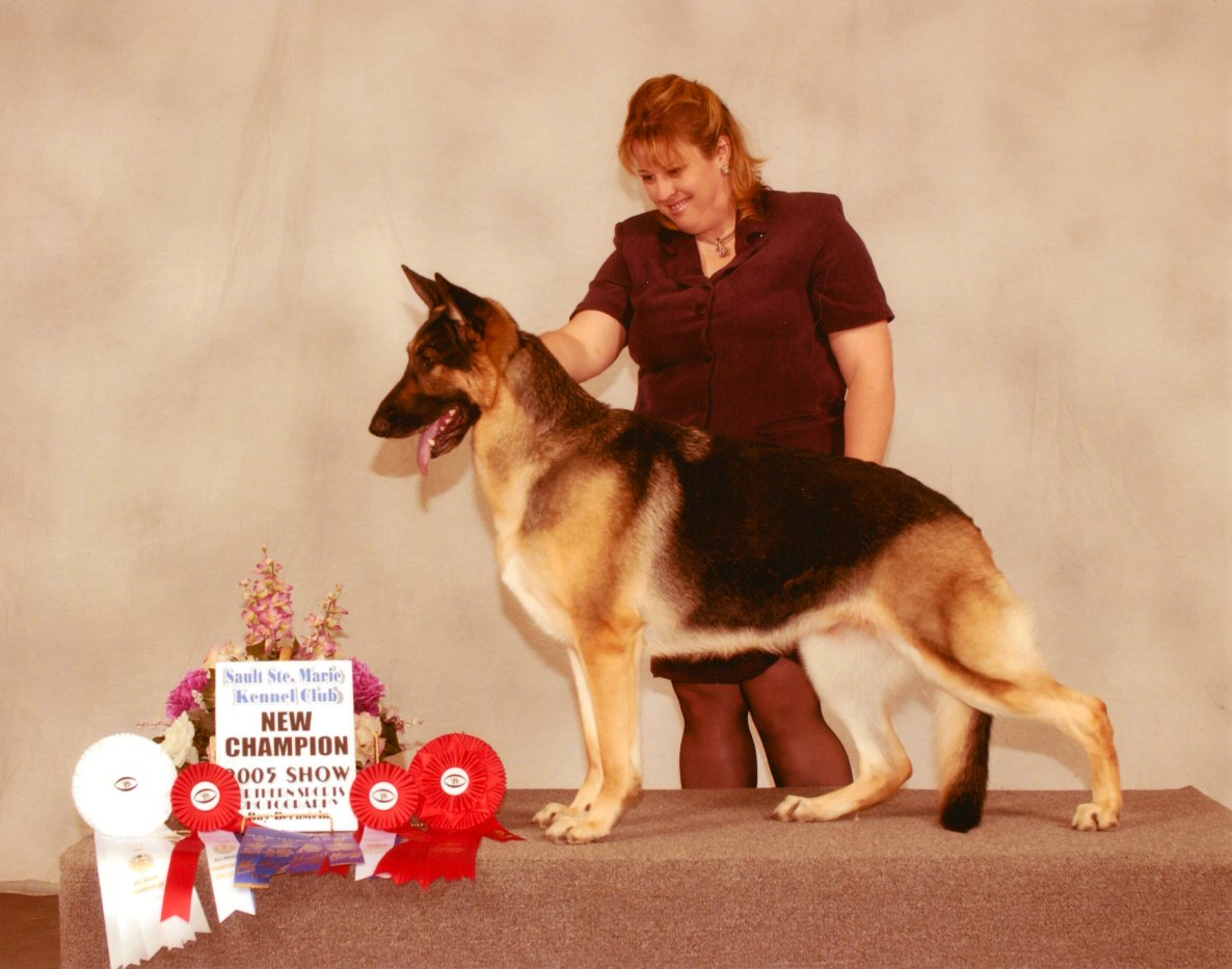 I grew up with German shepherds but made the switch over to Belgian shepherds. I also show, but mine aren't champions yet -- Solo is only 9 weeks old, and Visa has 5 points towards her Canadian CH from one day of showing -- I plan to finish both her and Solo next year.