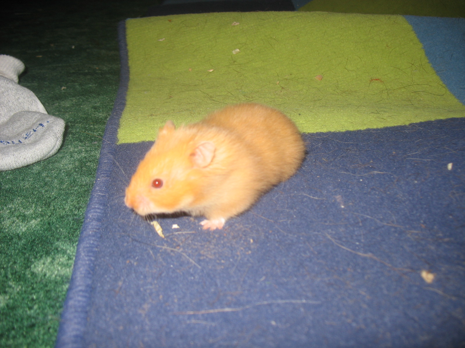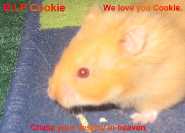 Cookie was one of my first three hamsters. We went to PETCO and my sister picked out a big golden rescue girl. She was supposed to be my sisters little hammy– as I had two Dwarf hammies of my own (Nutmeg & Marcy). After spending $200 on supplies for six hamsters, we got in the car and were on our way home. Laura was sticking her fingers in the cardboard transportation box where her golden hamster sat – feeding the little hamster treats and thinking of a name for her – she decided to name her Cookie because of her color and how much she liked her little ‘hamster cookies’. I must add that on the first day, the day that was being handled for the first time, and by a person she didn’t know, the little girl didn’t bite my sister once, or on any other day for that matter. Once home she was in her ball running around while we set up all the six cages – which was very frustrating by the way. After setting up the cages (finally!) she enjoyed running around the biggest cage she’d ever been in- way better than the container she was in at the pet store.