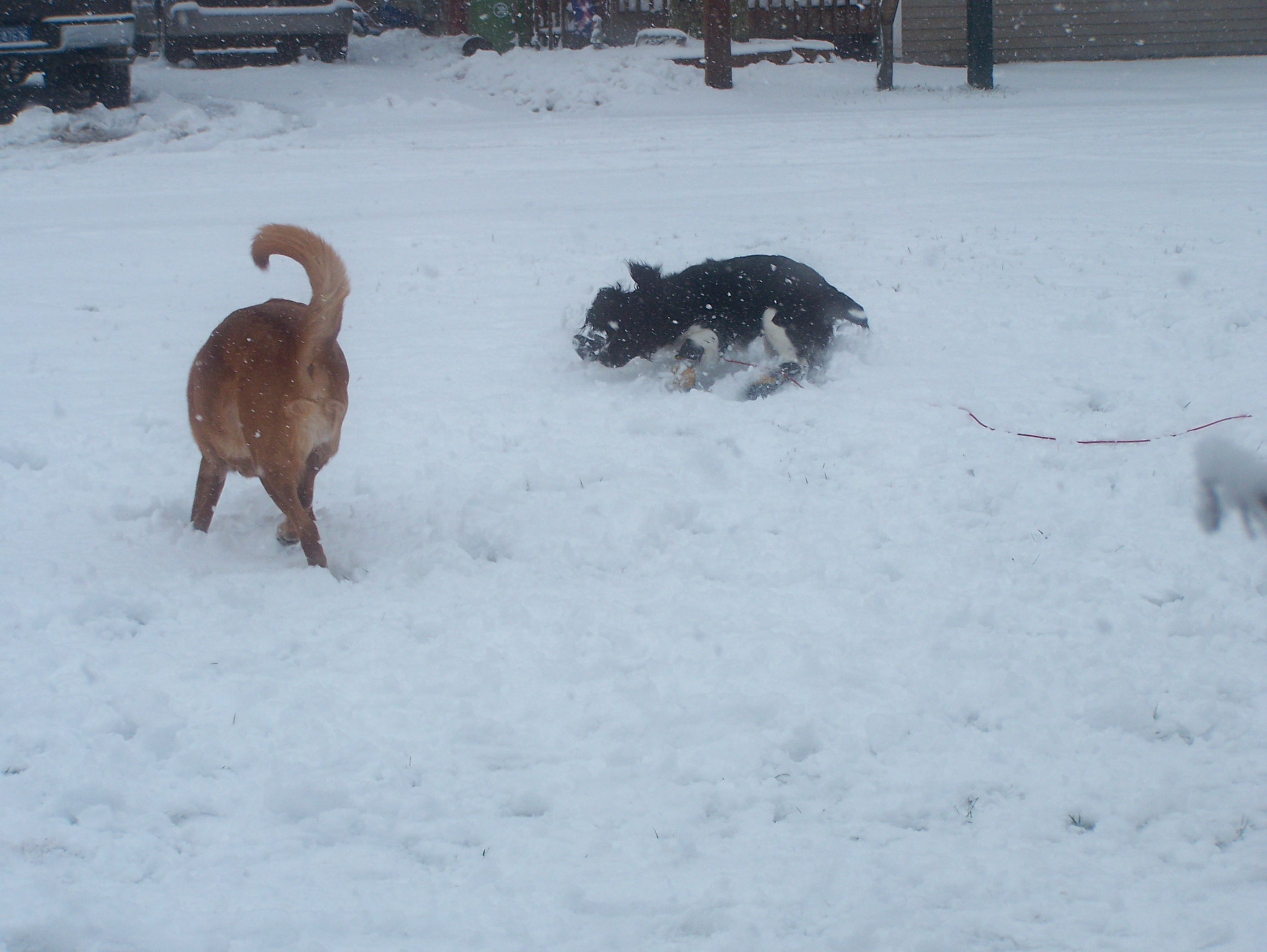 Lou Lou and Winchester love to play in the snow. It was fun to watch them have so much fun. Lou Lou has her new boots on and is on a chain only because fence was iced shut. Winchester stays in the yard really good but Lou Lou is to easily destracted.![]()
