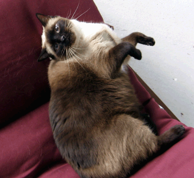 The first pic is his glamour shot. The second is his "I'm being cute now pose" with his paws up and his head twisted around.