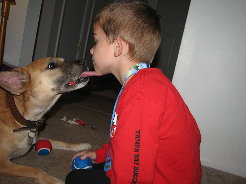 Here's a photo of Simba from yesterday. He is getting loved on by my brother's girlfriend's son, Noah. Simba just loves little kids! The other is Simba giving Noah a kiss.You can see Simba has a bit of wrapping paper in his mouth.