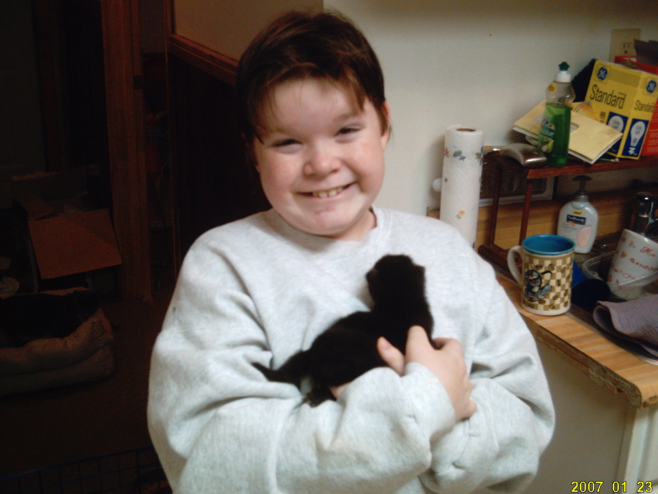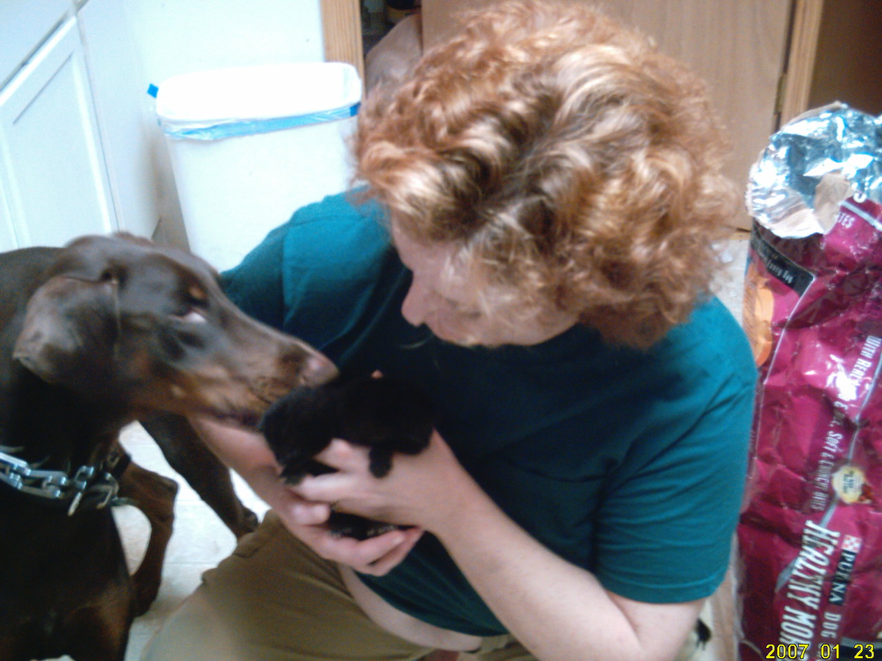 The handsome boy is the rescuer of their mom, our son Adrian. Needless to say mama dobies are never far from the kittens or the boy![]()