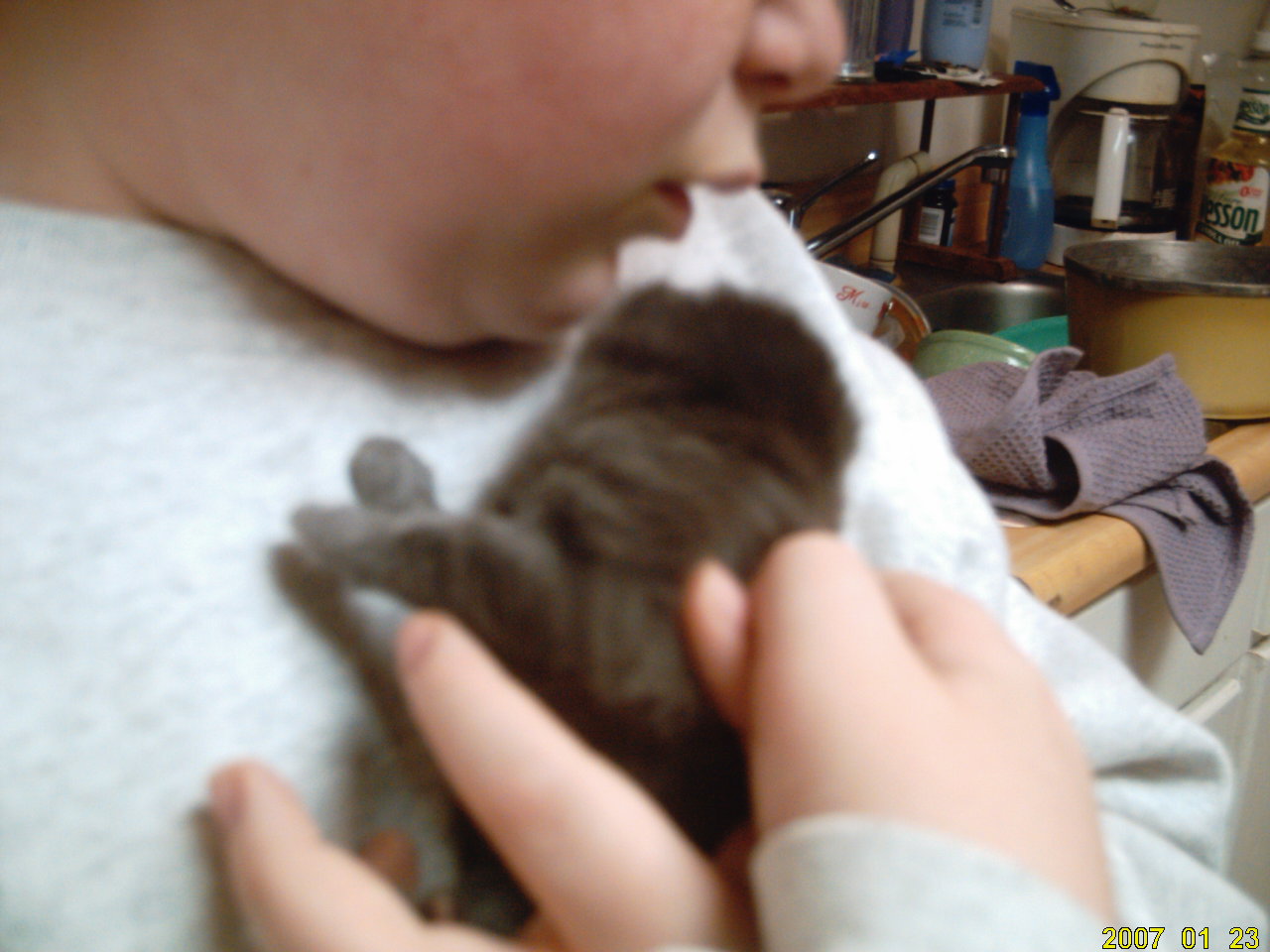 Sprokket, I have heard your opinions, and I thank you again for your concern,however I will reiterate that in 25 years we have never had a mother reject any litter for being handled.Ferrets included. Lilly and her siblings are all feral rescues at(approx) 14 days old , their mom was run over by a car. My son bottle fed them and raised them all by hand, with a doting dobie to watch over them. As Lilly and the kittens will be spayed in another few weeks the point is moot,in regards to her litter.