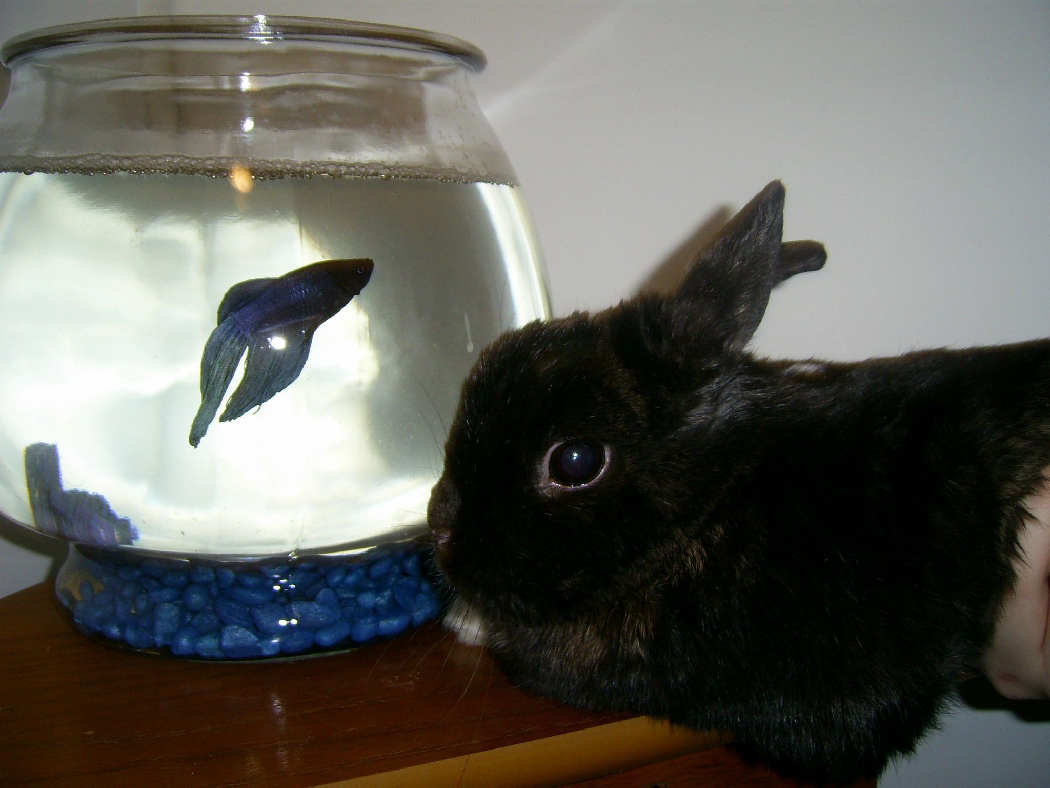 Awwww! That is so adorable! I love how the bunny had his own betta fishy So cute. And it looks like your bunny is a netherland Dwarf bunny, those are my favorite rabbit breeds, I think their little ears are so adorable