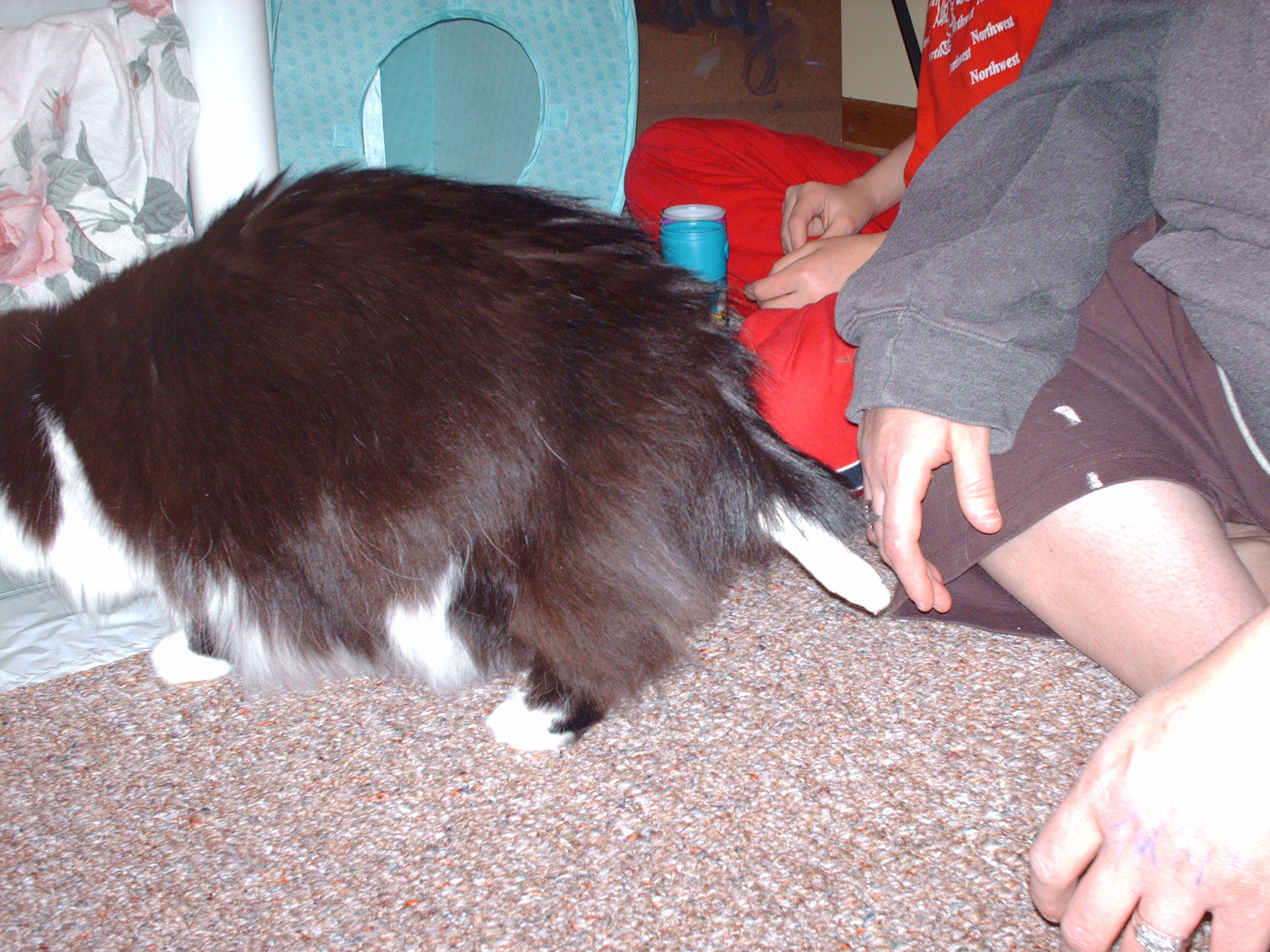I apologize for not posting better pix. Kiara is definitely camera shy. She closed her eyes for many. She was hiding under the bed when I arrived, so I got down on all fours and softly called her name. She came out from under the bed and gave me head bumpies, then rubbed her face all over mine. She didn't want to be held but she loved being petted. And at one point, she even turned her tail to me as if to say "Look at what that dog did to me" and I shot the pix. (The woman said it's a stub but it clearly isn't. She's got a long tail and I'd say that 1/4 of it is gone.) Sorry, no Photobucket. It's been another long day and I just wanted to get pix of Kiara posted as quickly as possible. Thank you again, friends, for all your support. I just love a happy ending! Here she is: