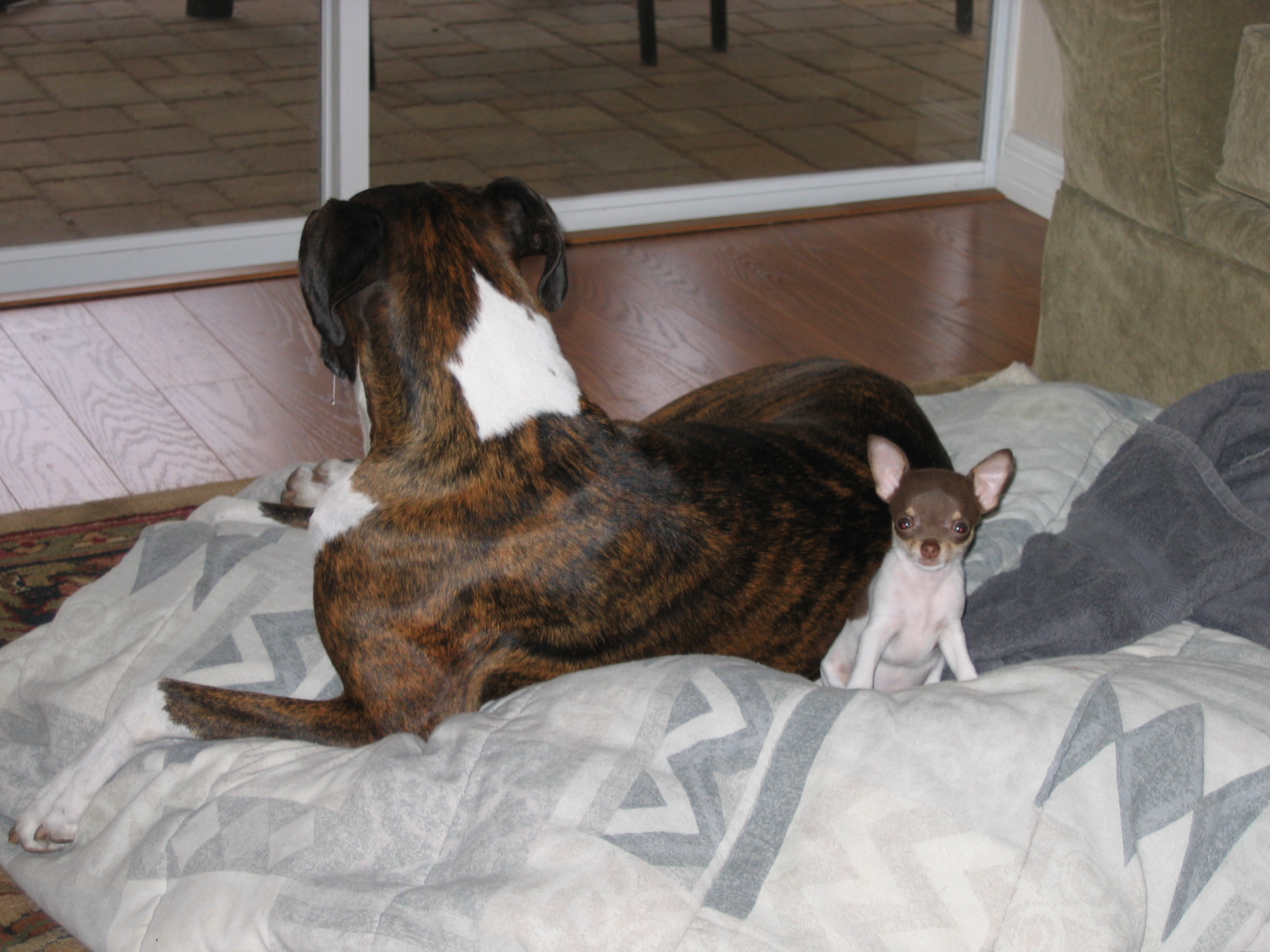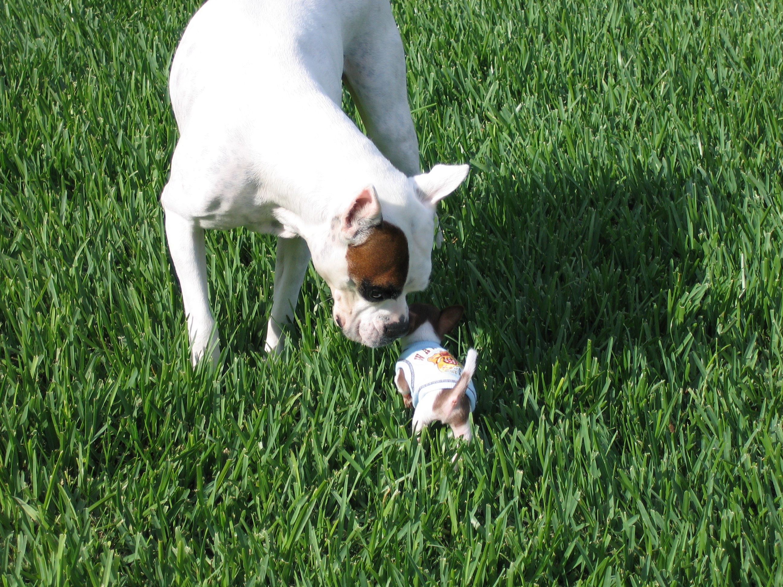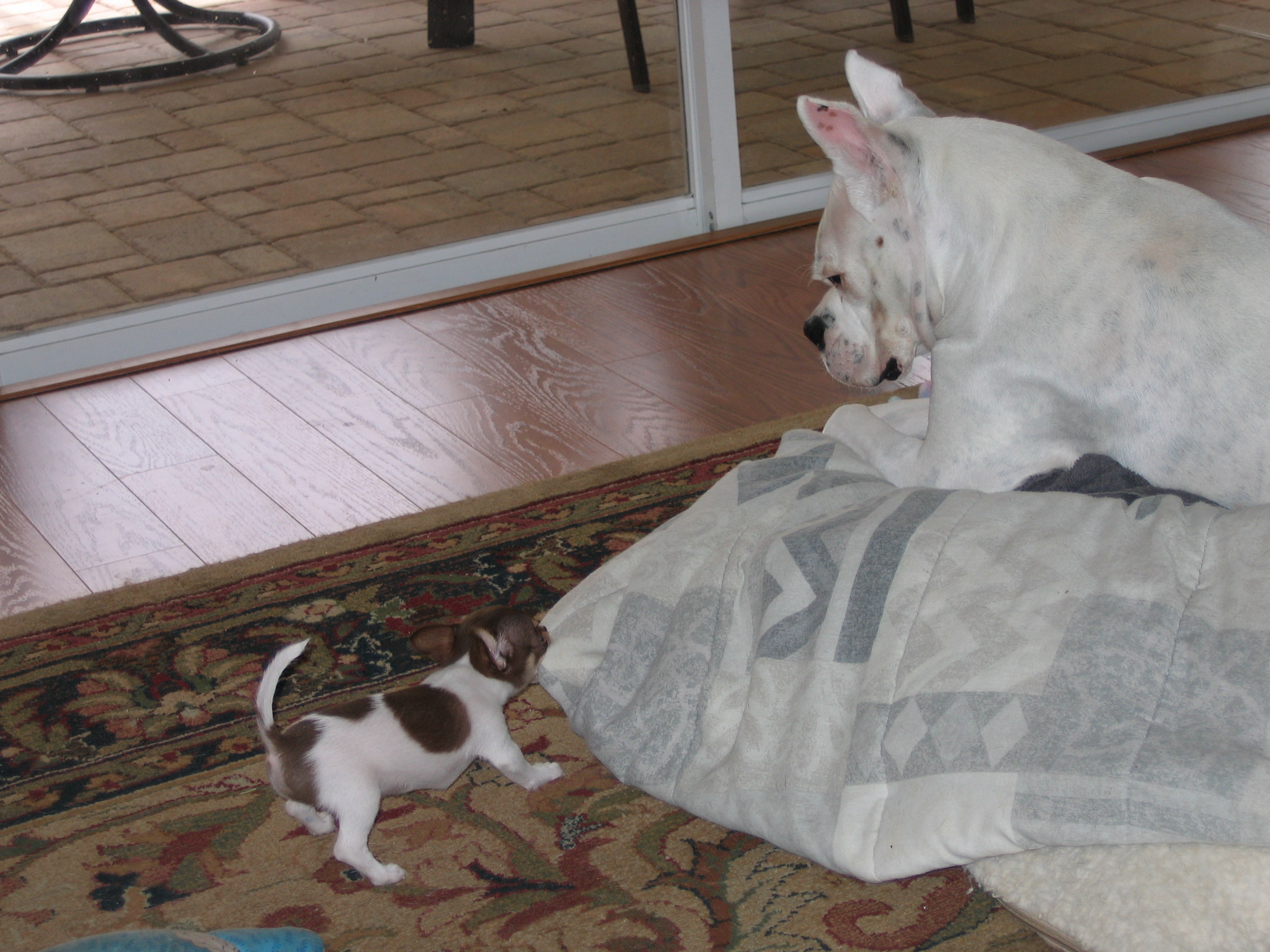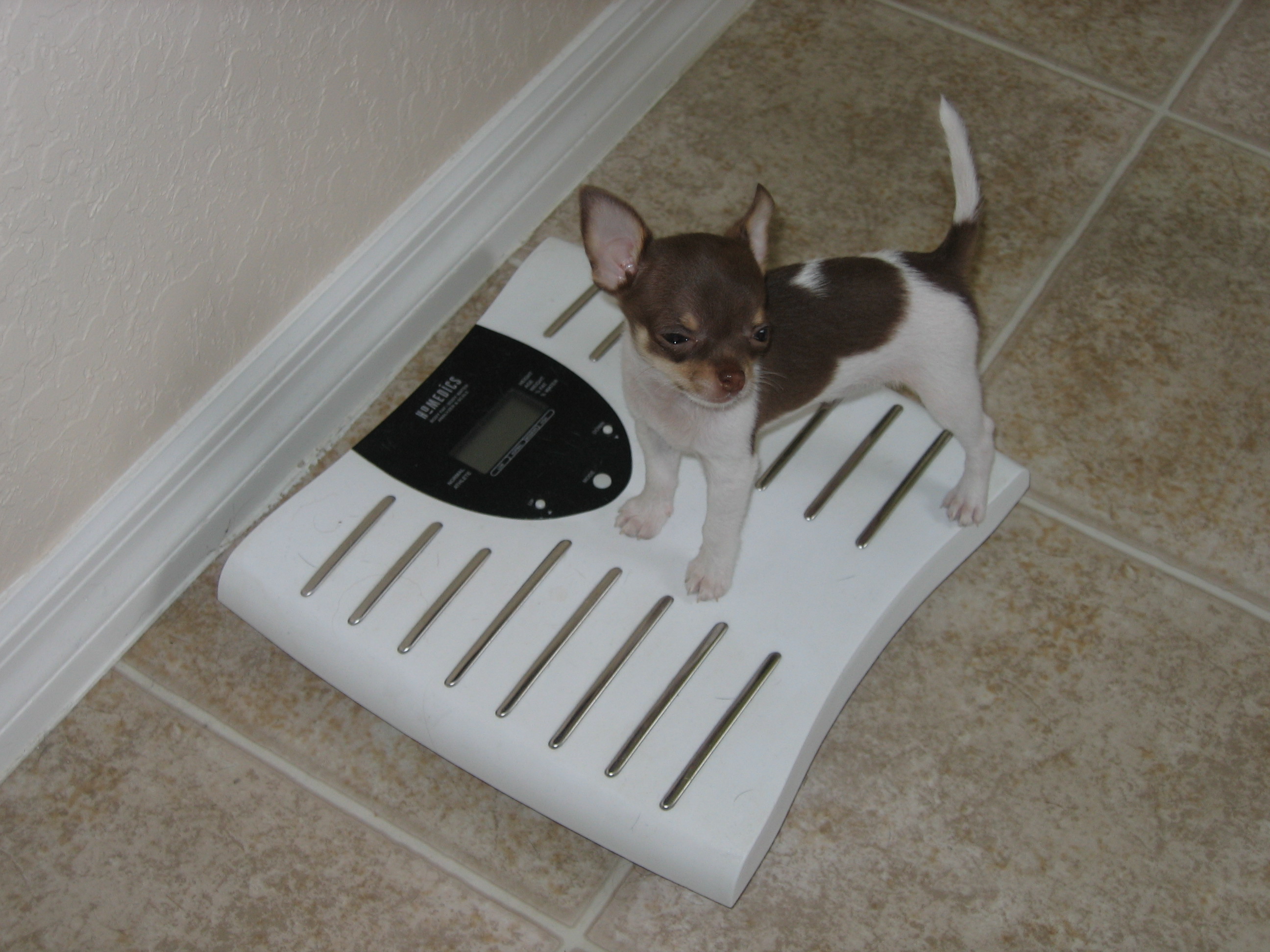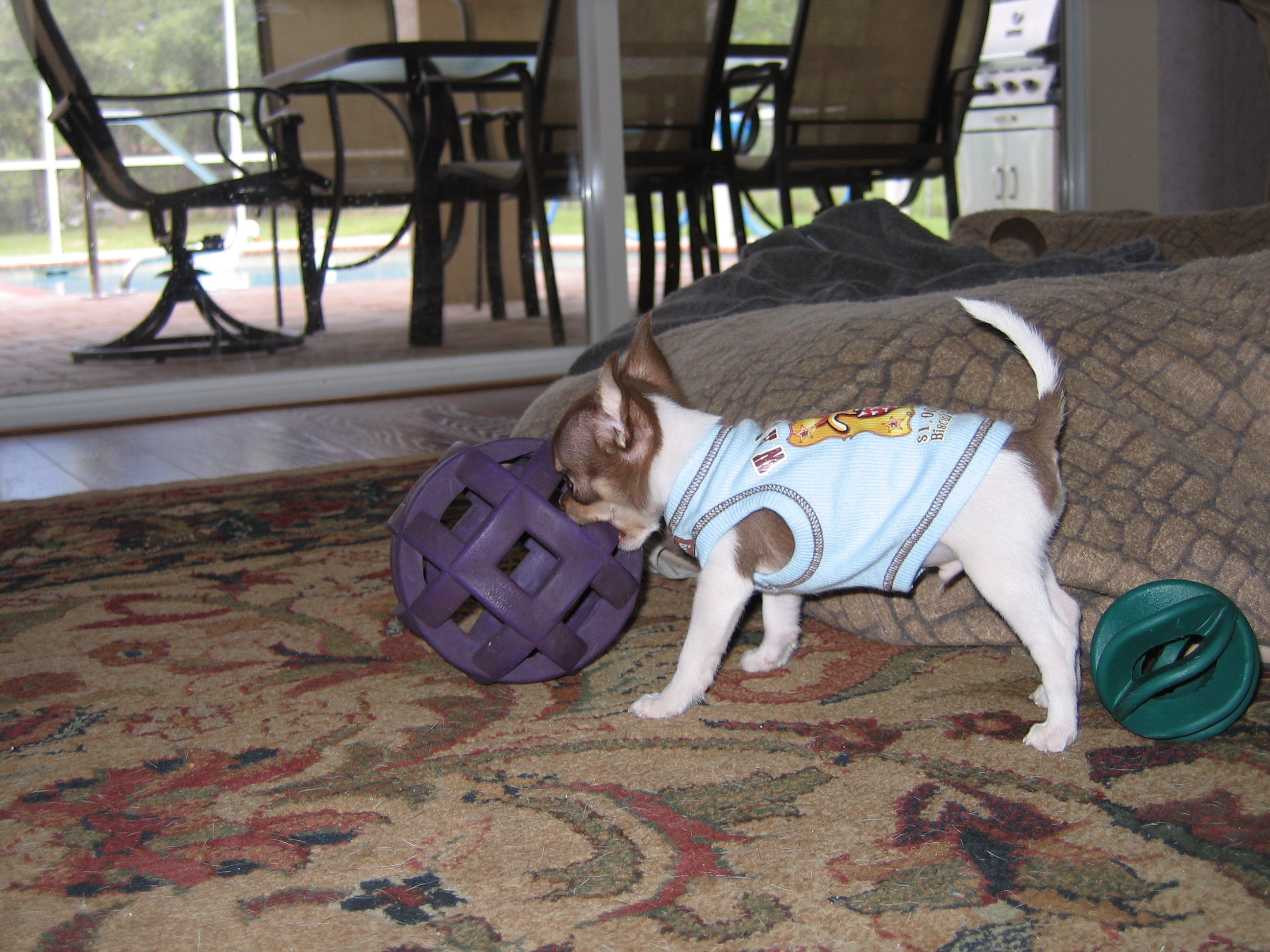 Here are some pics of Chopper and his big brother Duke and big sister Champ. He found one of their big balls and was trying to drag it around. He also wanted everyone to see him on the scale so you would know he was growing(don't tell him he didn't even register LOL)![]()