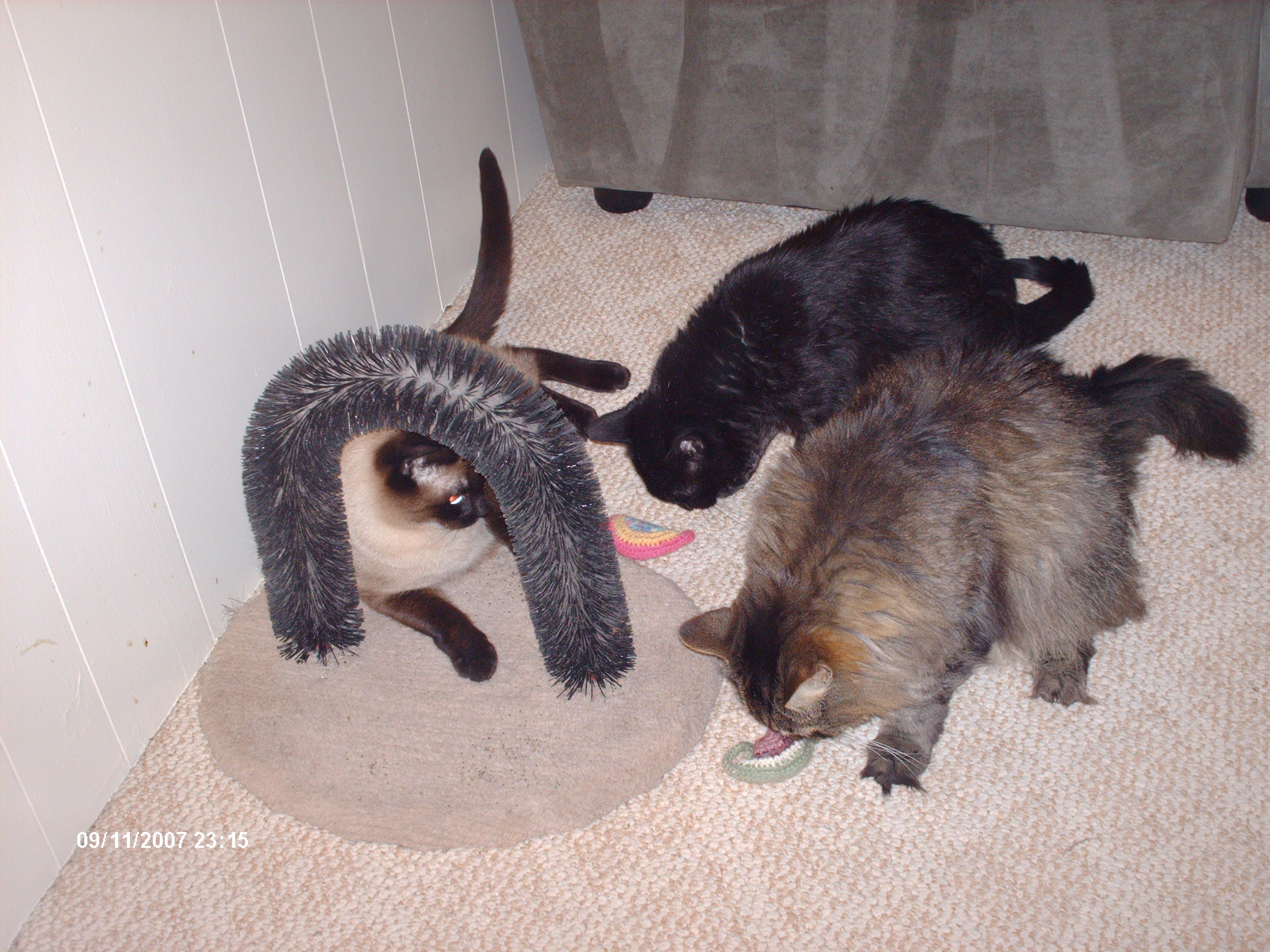 Name:	The fur posse checking out the new catnip toy.JPG