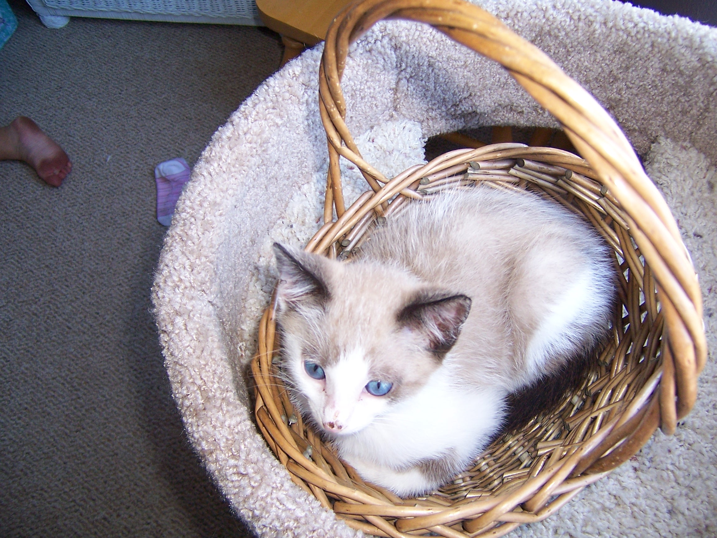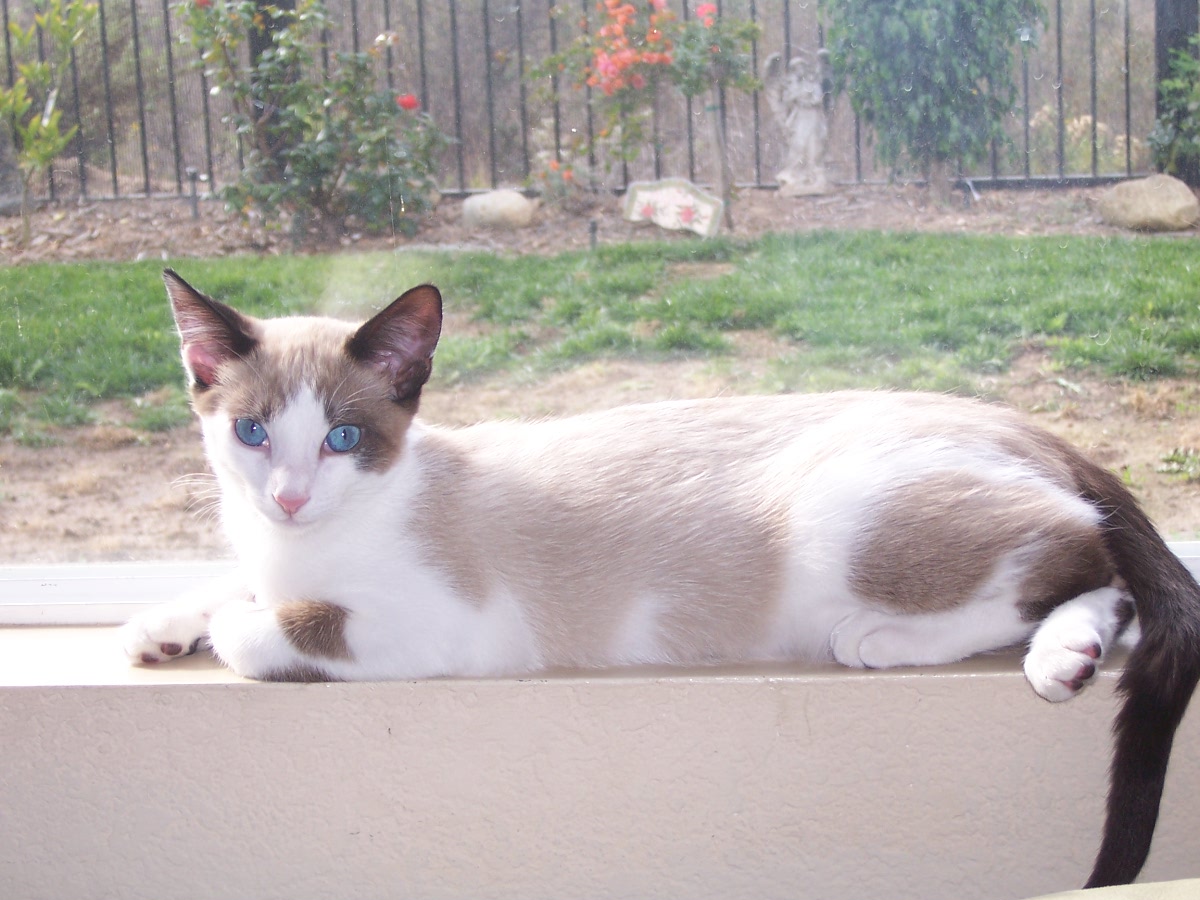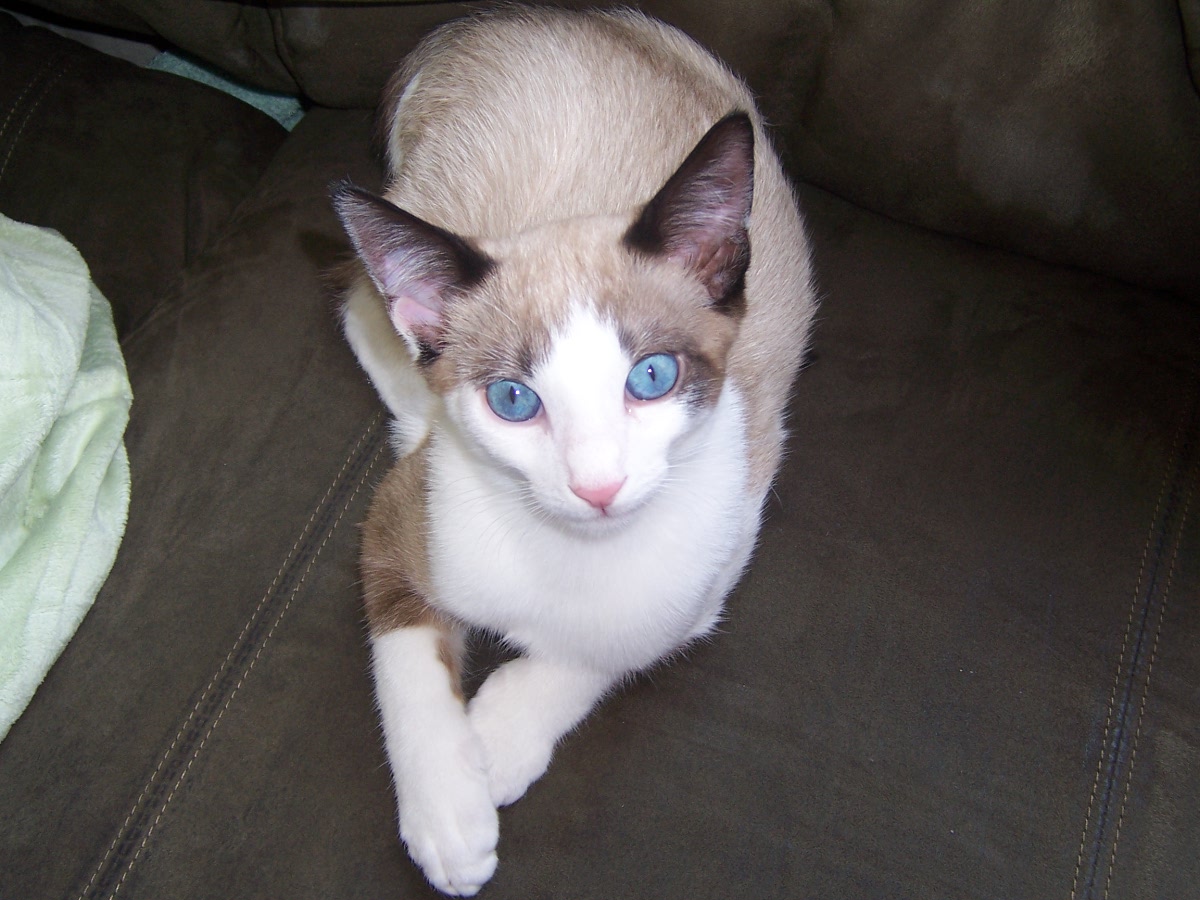 I am sure some of you remember Jake, our new Siamese or Snowshoe/Mix kitten. If you don't, I am adding pictures, so don't worry. Anyways, he is kind of congested. I don't think he has a fever, and he doesn't have discharge from the eyes. But his breathing isn't very clear; it sounds congested. And his nose isn't wet. (Isn't it supposed to be?) Is he sick? If so, with what? When he was in the shelter, he got Upper Respitory Infection, and I've heard it can come back. But does he have that? Also, he has a healthy appetite (he LOVES to eat) and he is still pretty playful (although he is sleeping right now.) Have any advice? Thanks a lot!