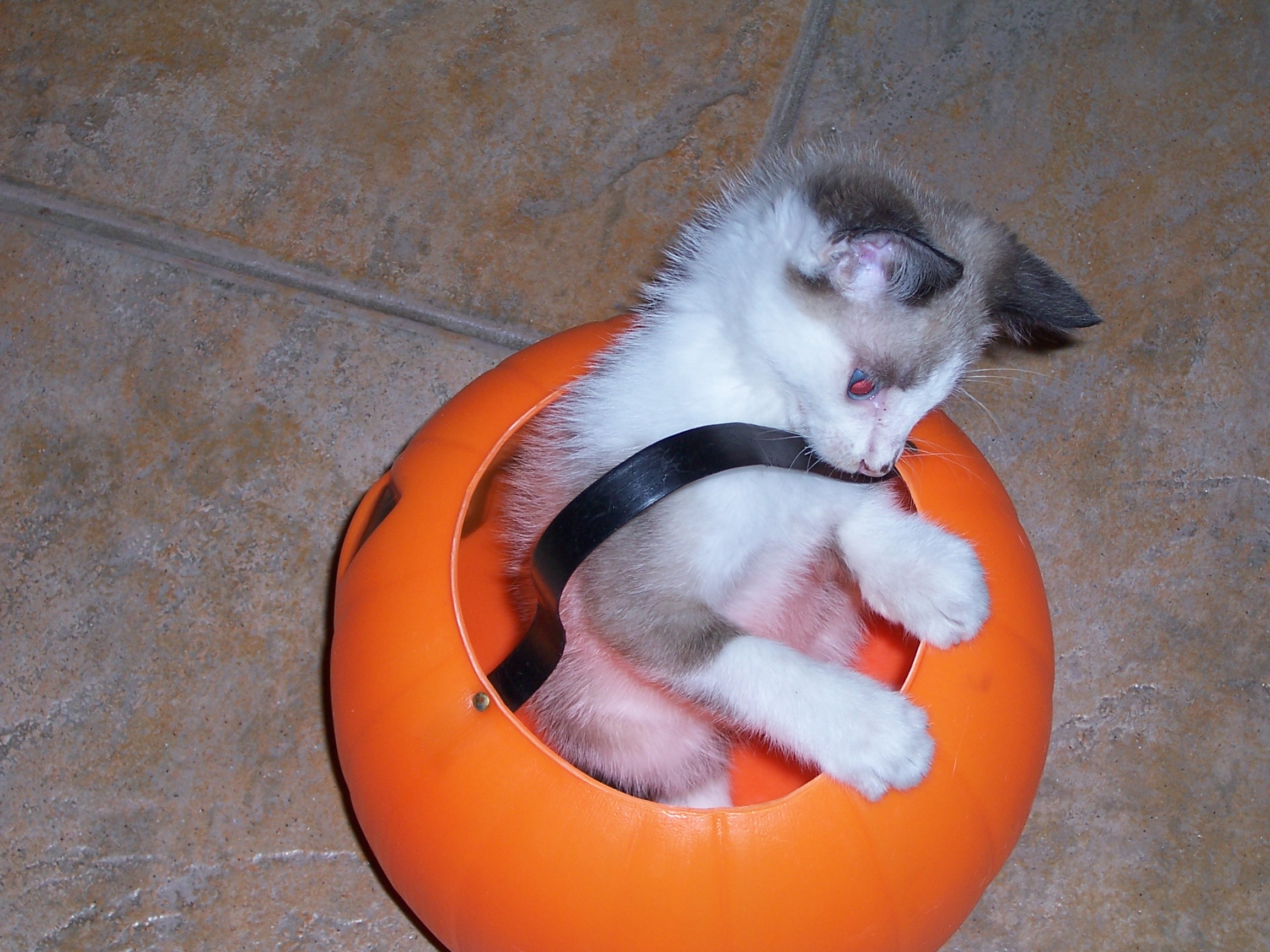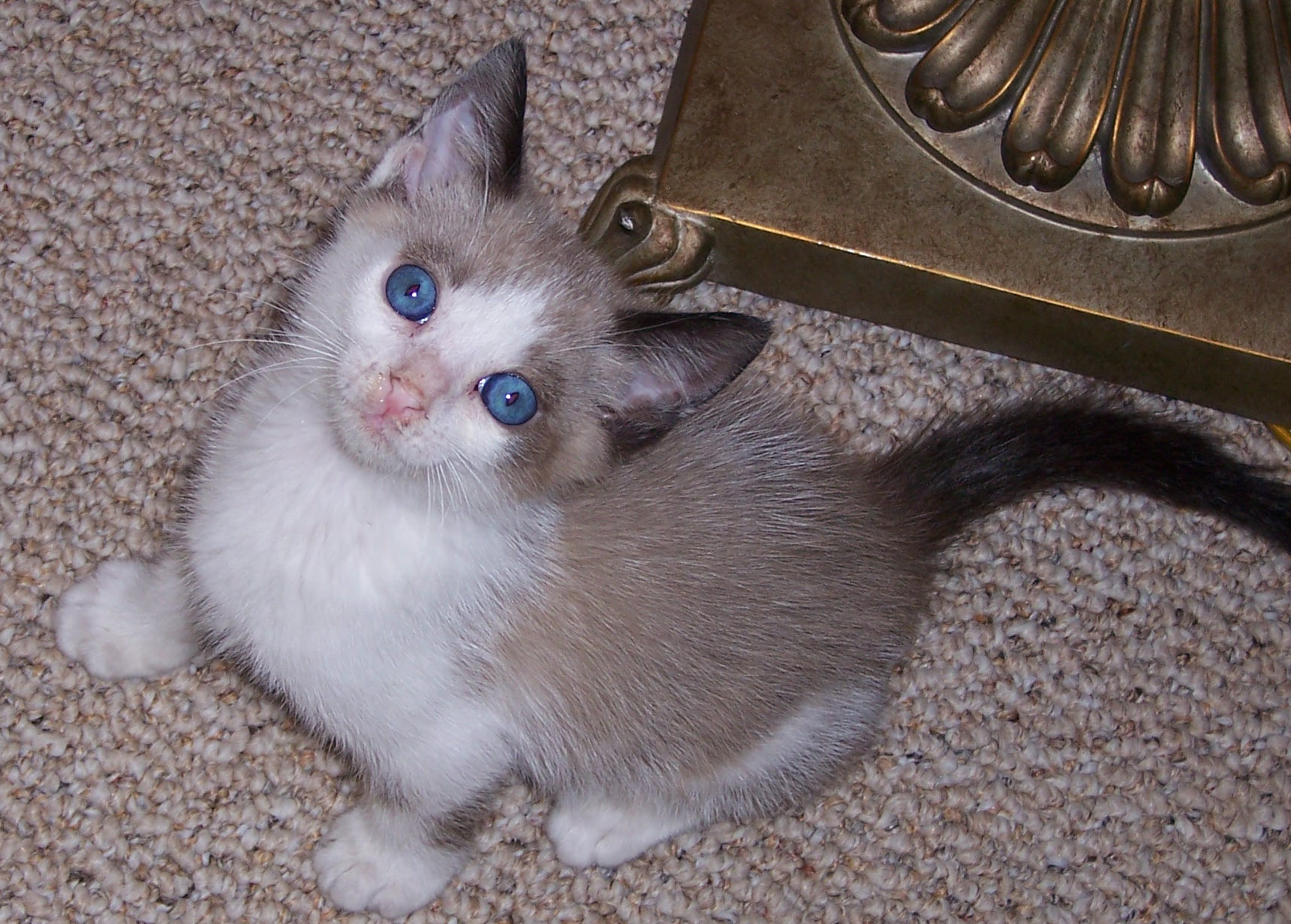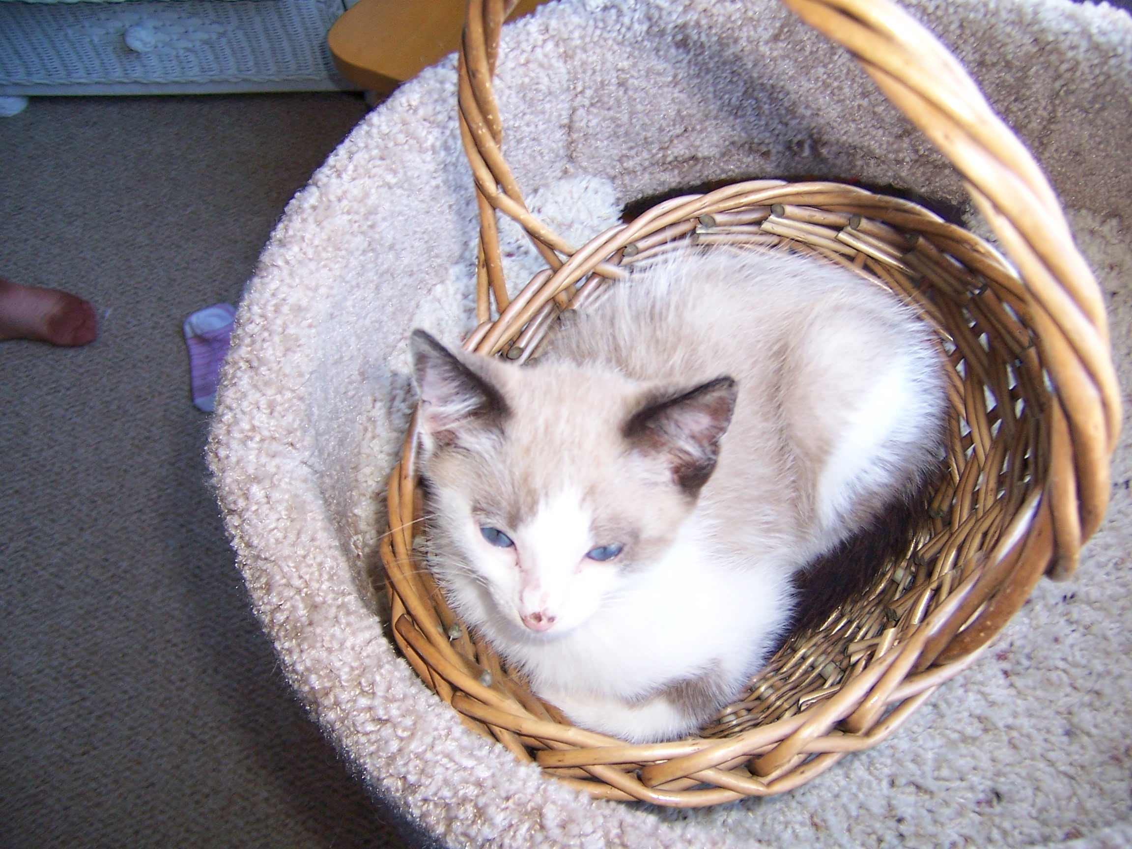 I am sure some of you remember Jake, our new Siamese or Snowshoe/Mix kitten. If you don't, I am adding pictures, so don't worry. Anyways, he is kind of congested. I don't think he has a fever, and he doesn't have discharge from the eyes. But his breathing isn't very clear; it sounds congested. And his nose isn't wet. (Isn't it supposed to be?) Is he sick? If so, with what? When he was in the shelter, he got Upper Respitory Infection, and I've heard it can come back. But does he have that? Also, he has a healthy appetite (he LOVES to eat) and he is still pretty playful (although he is sleeping right now.) Have any advice? Thanks a lot!