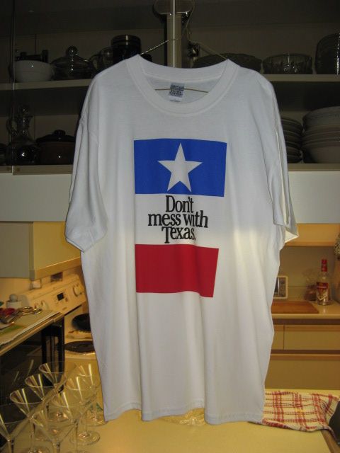 - T-shirt, size L. Never worn. White with logo "Don't Mess With Texas". I won this (can't remember where) about 6 years ago and I never wore it because it never fit. Now it's time to send it off to a new home. See attached pic. Martini glasses and vodka in the background not included.