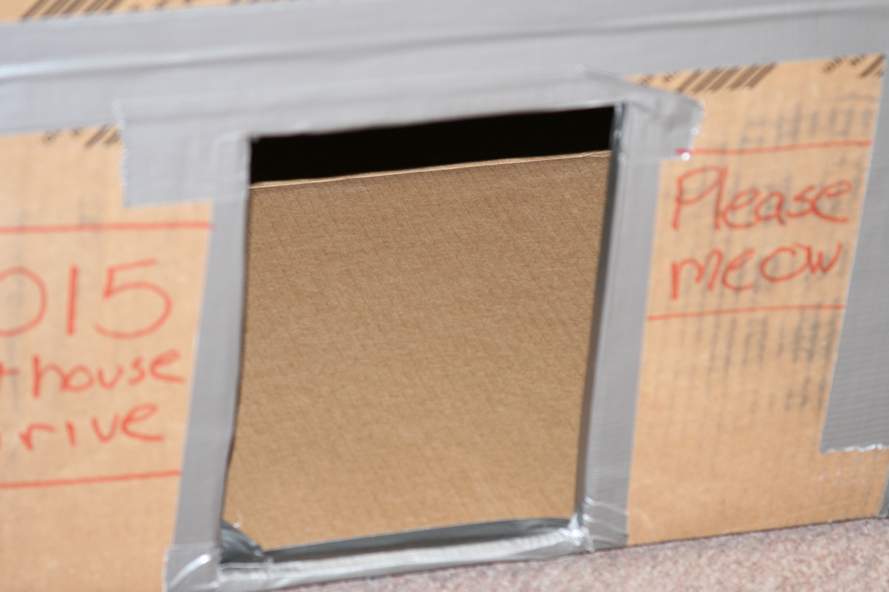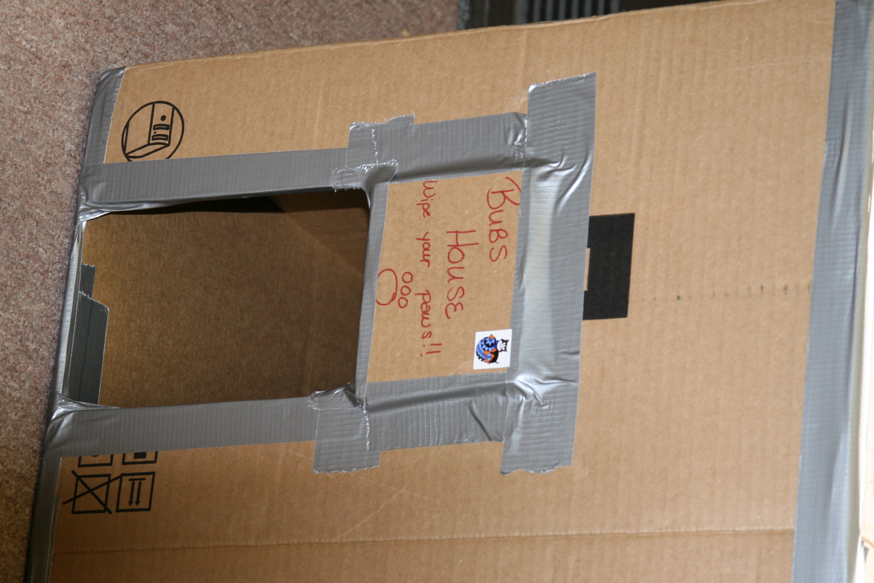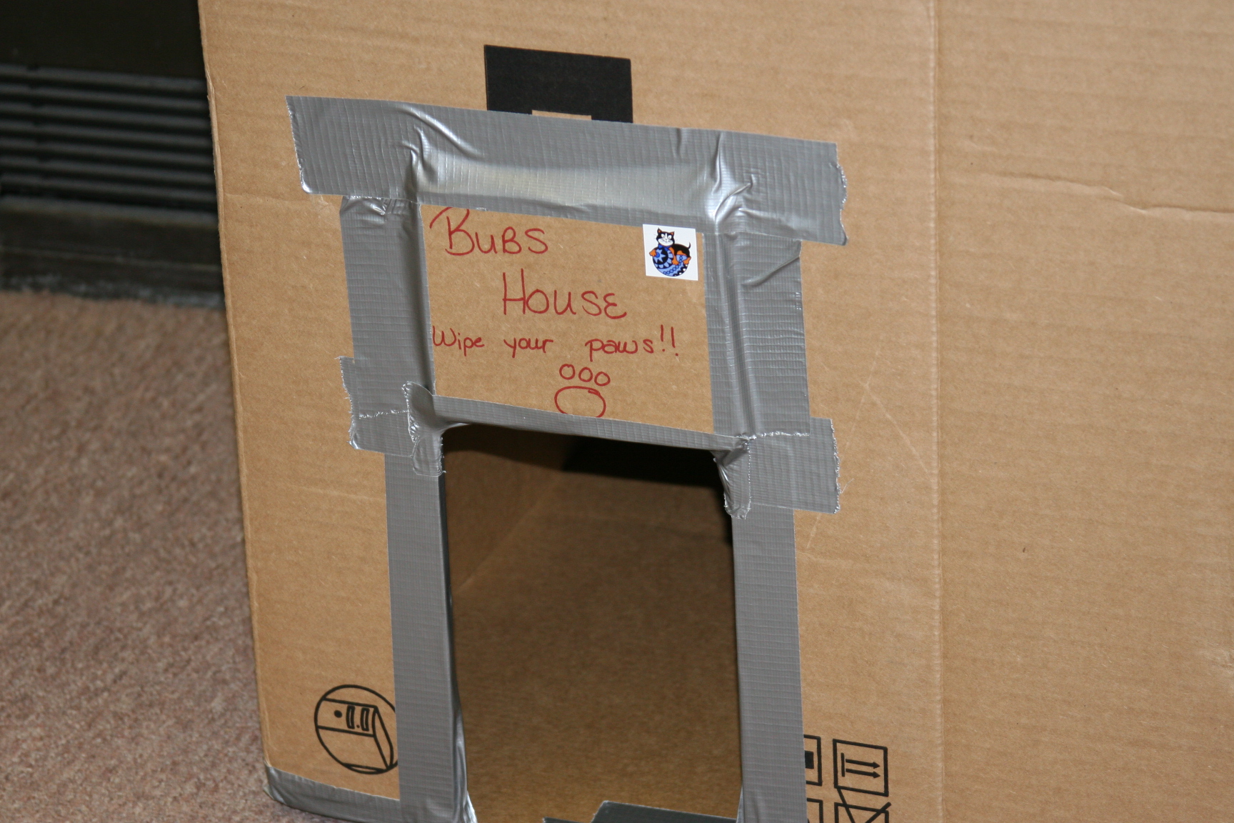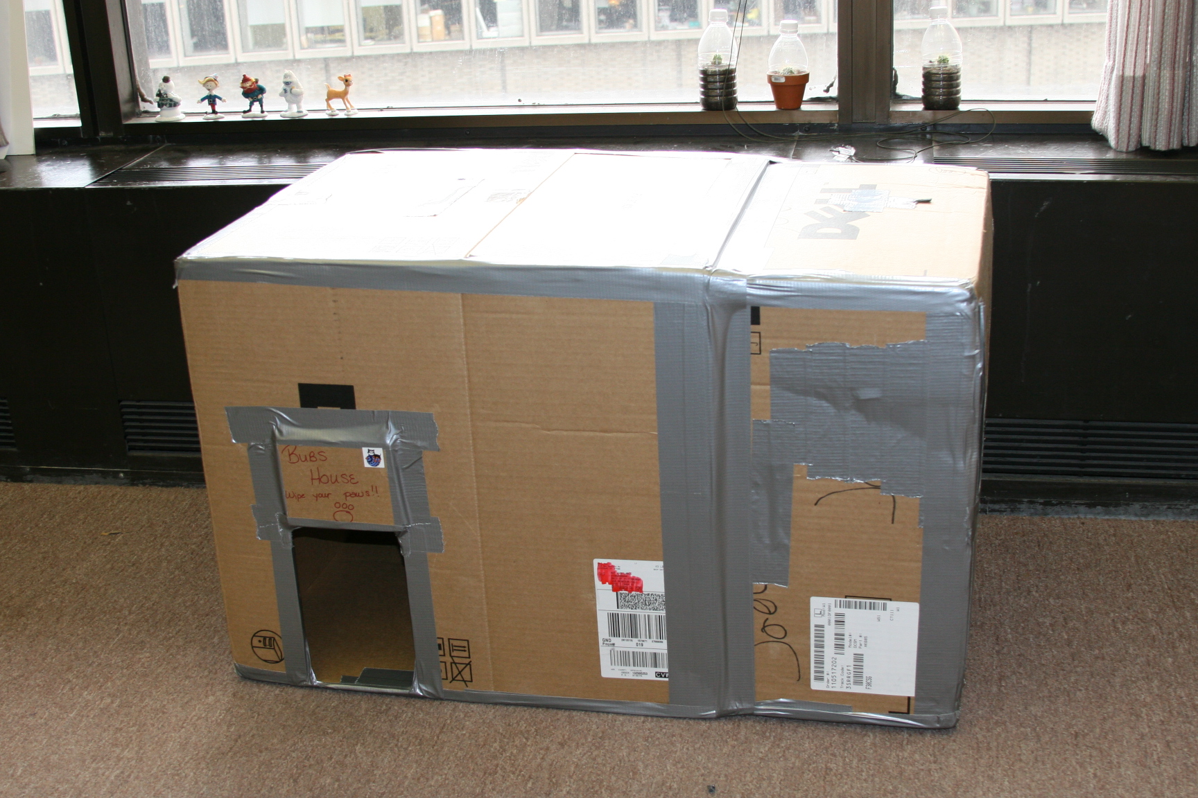 We have been feeding a stray for a good while. I believe it to be a male based on the spraying and for some reaon I have named him Bubs....it works. Anyway he lives in a box that we have filled with straw or hay(I never remember which it is, hubby knows) and it is on the porch of the empty house next door. The box has been there for about 2 years I think and is starting to show some signs of needing replaced. So I told my co-worker to save me a few computer boxes. He asked why and I told him...and this is what we did earlier today!