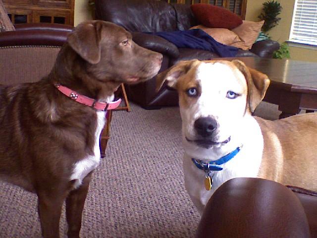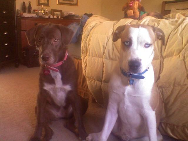 These are my dogs Juno and Kahlua, they are both rescued mixed breeds. Kahlua (brown dog) is supposedly a chocolate lab/border collie mix and I believe it is true. Both dogs were adopted as puppies and are about a year old now. Juno (blue eyes) is the one I need some help with... I was told he was a husky mix when we adopted him and I think he might be, but we can't figure out what other breed(s) he might be mixed with? Any suggestions???