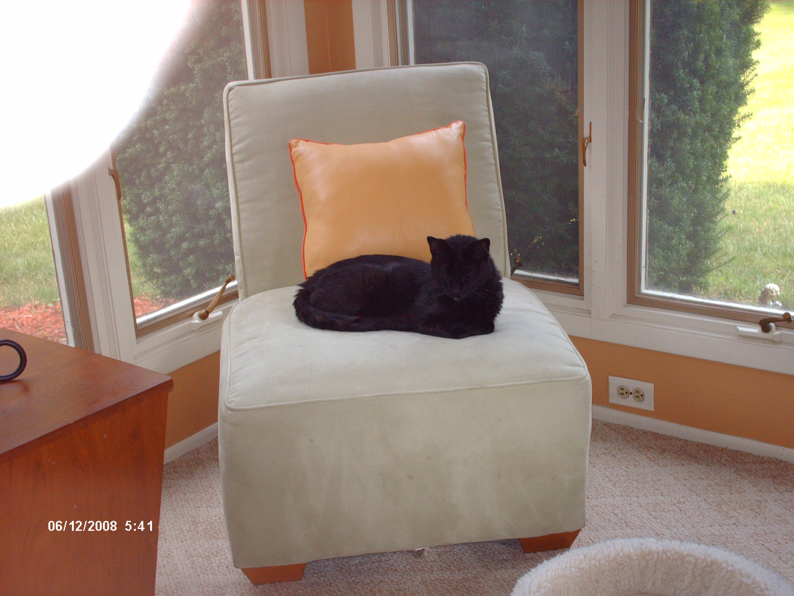 He loves it when I toss him over my shoulder, cup my hand and spank his bottom so that it makes a loud noise. He purrs like a motor boat. I did it today and noticed that he became so relaxed that his body went limp and he actually started snoring! Now that's security! He has taken my Calico Queen Puddy's place as the guardian of the house. Well, actually, he and Puddy guard it together. Sorry about the eyes in the photo. Crummy camera. Pretty studly for a 17 year old, huh?![]()