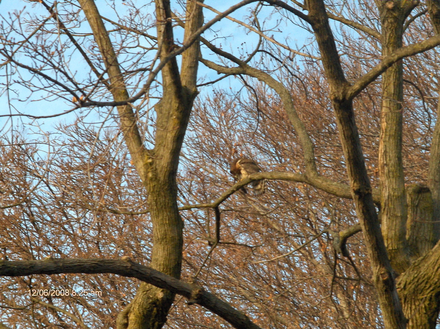 I went to see what it was, and found this bird, which I believe is a hawk, in the tree next door. I think he's injured as well. There was another bird with him that I didn't see until they took off together, but wow! What a sight!