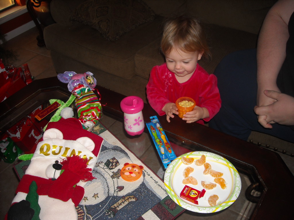 In Quinn's stocking Santa put a sippy cup of fresh juice, a mini box of raisins, a banana, a clementine, and a little snack container of Kix cereal. Boy, Santa knows JUST what she likes!!! The first picture is of some of her stocking loot after she polished off the banana.