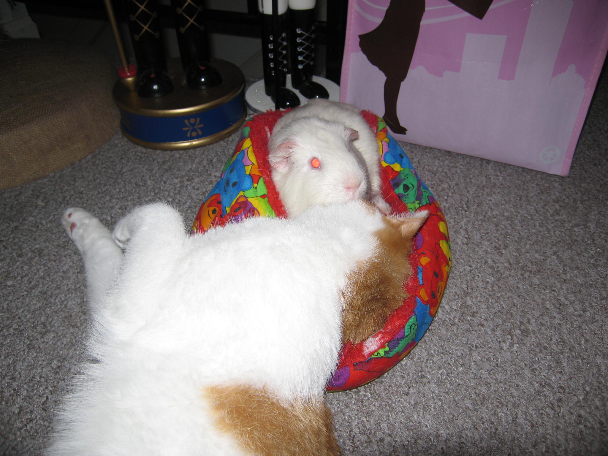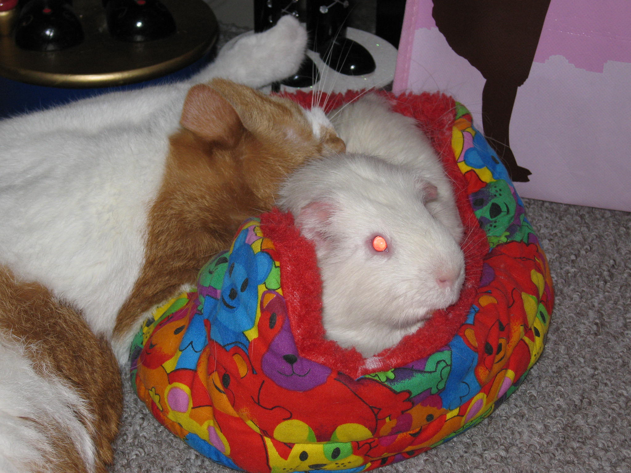 I have my niece's 2 guinea pigs here during spring break, and Owen is very serious and diligent about pigsitting. They are used to cats because they have 3 of their own at home. Owen loves getting in the cage w/ Buddy. Here are 2 pics of Owen and Buddy hanging out this weekend outside of the cage.