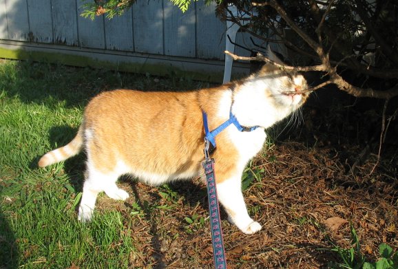First pic he is sniffing the shrub where a neighbor cat stopped to rub on the branch earlier.