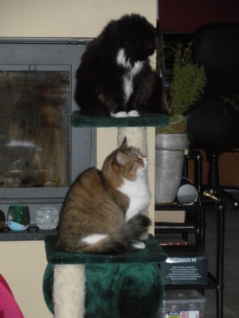 Looks like you either need a bigger tower or a second one! Don't they just LOVE those things!! I need to redo my babies tower/tree we made them and I am hoping to get on that soon, maybe the next time I am home.. It needs new carpet and sisal rope.. The carpet on it is shredded!