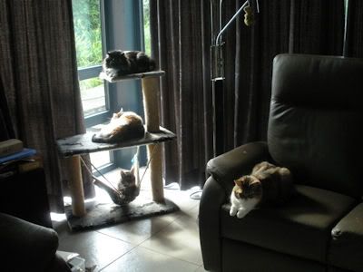 There are the beautiful Girls! Hello, precious kitties! How comfortable and content you all look!