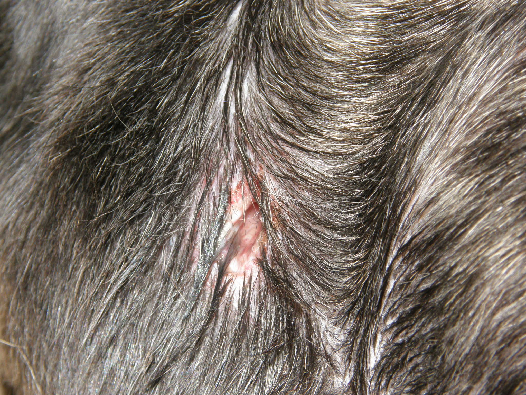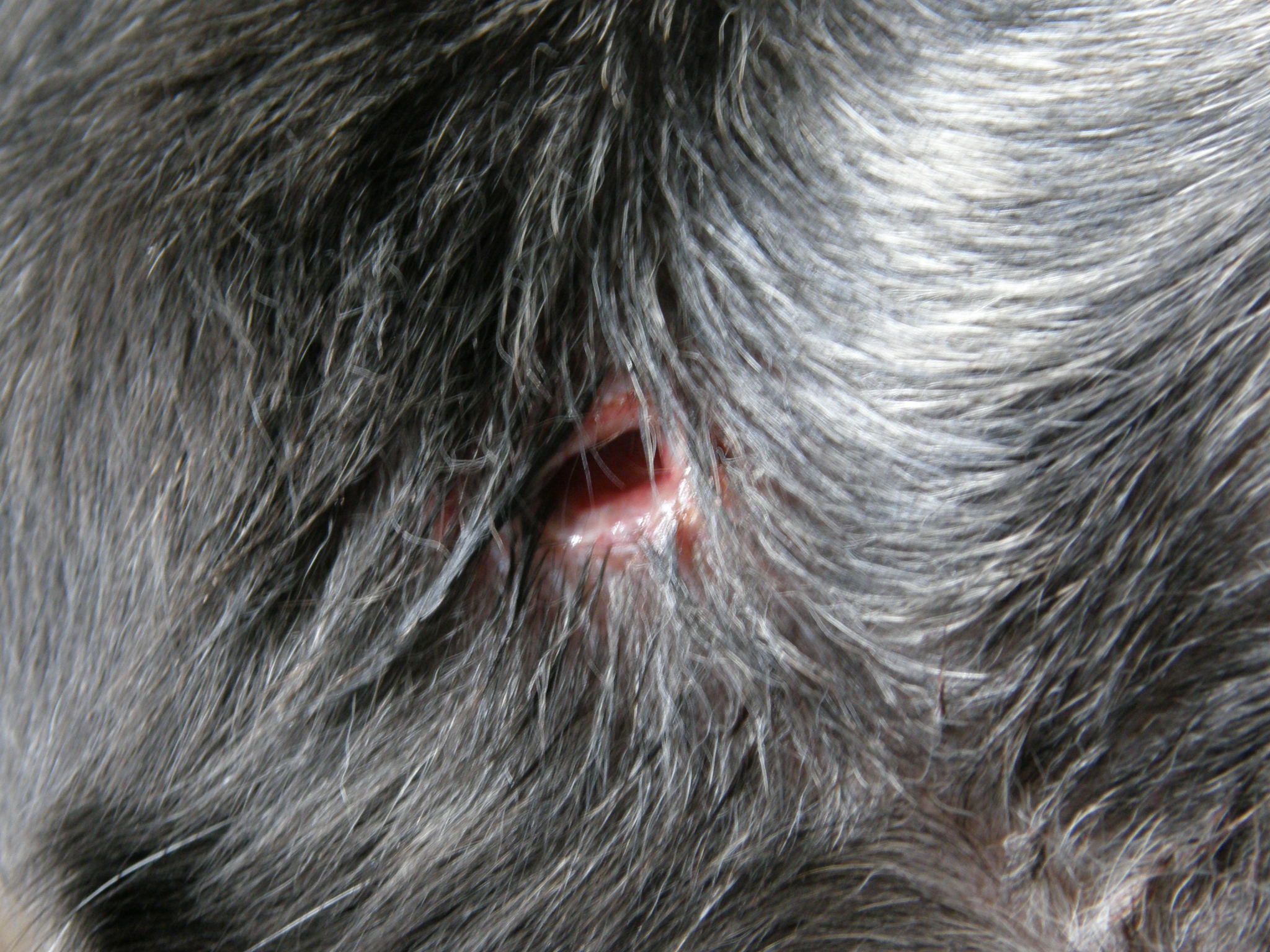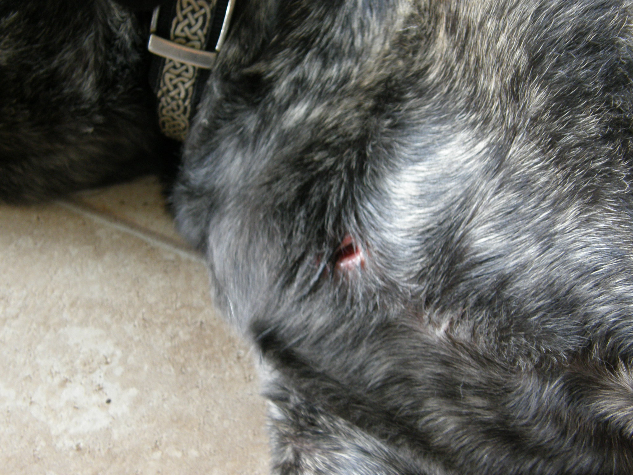 I thought it was a bite at first, but it's an awful big hole and there's only one place. I swear it looks like he's been shot. Mark checked the whole yard to see if there was anything that could have done it, but of course couldn't find anything. As usual when they get hurt, it's a big mystery.