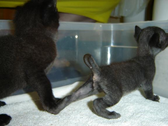 An underweight pregnant queen showed up in our garage in June. We caught her, housed and fed her. She settled right in and ate everything in sight On June 23, Pretty Mama gave birth to 5 babies: Job(b), Runt(b), Rex(g), Uber(g), Piggy(g). Despite all of our best effots, Job went up to the Rainbow Bridge at 2 weeks old Runt opened his eyes a whole week before his sisters He's been a bundle of dynamite from day one. He had to make up for being the smallest and hairless