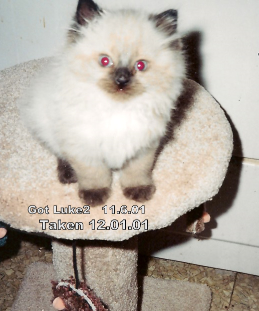 First of all, my Luke is the second Luke I've had. The first Luke was gotten by me in 1968. At the time Paul Newman was a popular movie star and he had great BLUE eyes. My first Luke, a Siamese, had lovely blue eyes and I thought of Paul Newman's blue eyes and then his movie Cool Hand LUKE and thus my little Siamese kitten became Luke. Luke1 was with me for 1968-1983. After Luke1 died, I decided I would have a housedog as pet/companion rather than a cat...and I did.