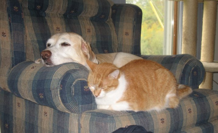 Casey was so good with the kittens we fostered and even let Max walk on her food bowl stand.