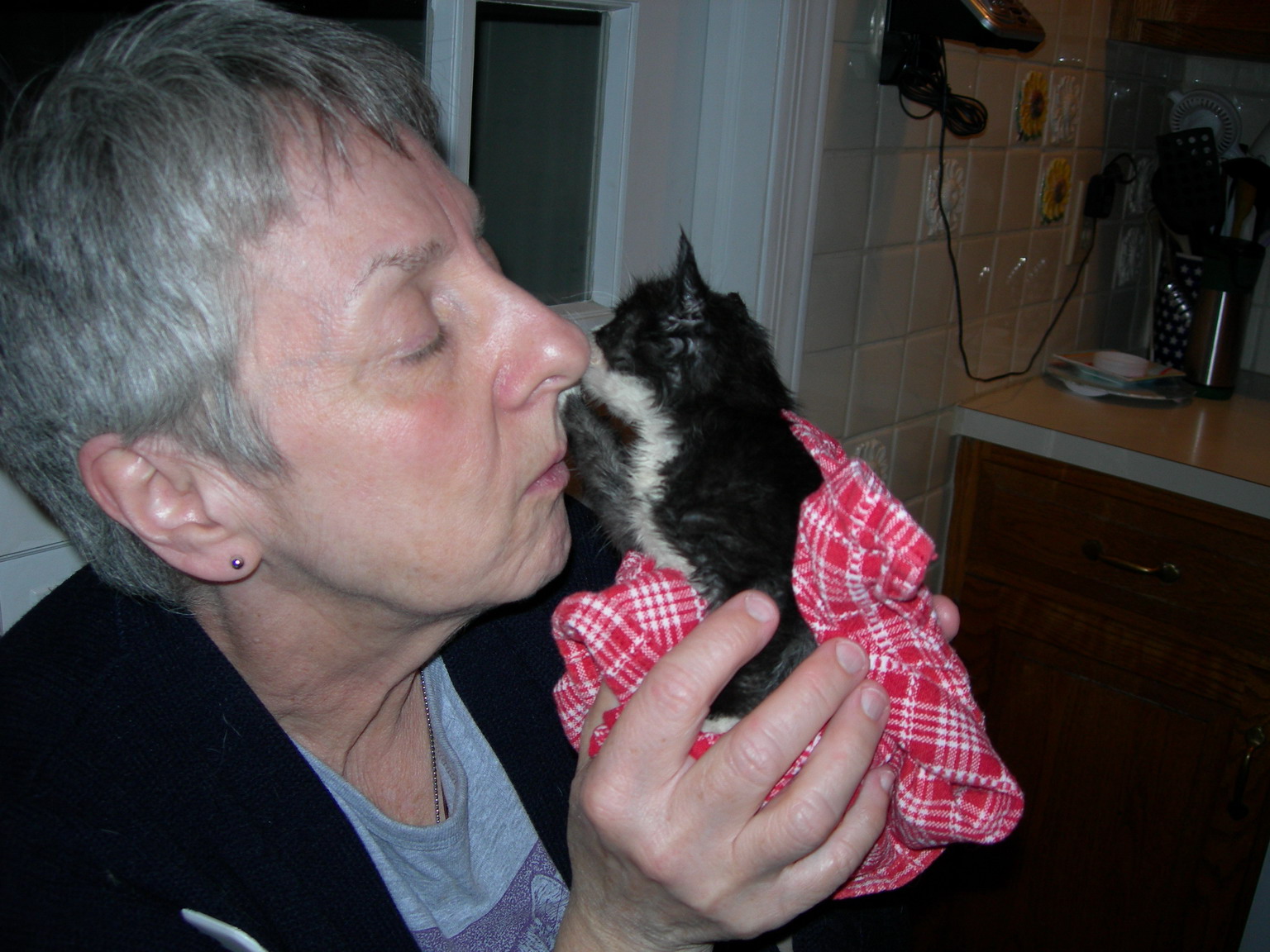 Your fur is so sleek and shiny, and you have such a sweet face with that white streak down toward your nose and those long, LOOOONG white whiskers and eyebrows and those lovely yellow-green eyes. I wish I could reach through the screen over to California to pet you, and pet all your kitty and Lab siblings too! I can't, but I'm sure your loving and beloved Purrrsons will pet you all for me .