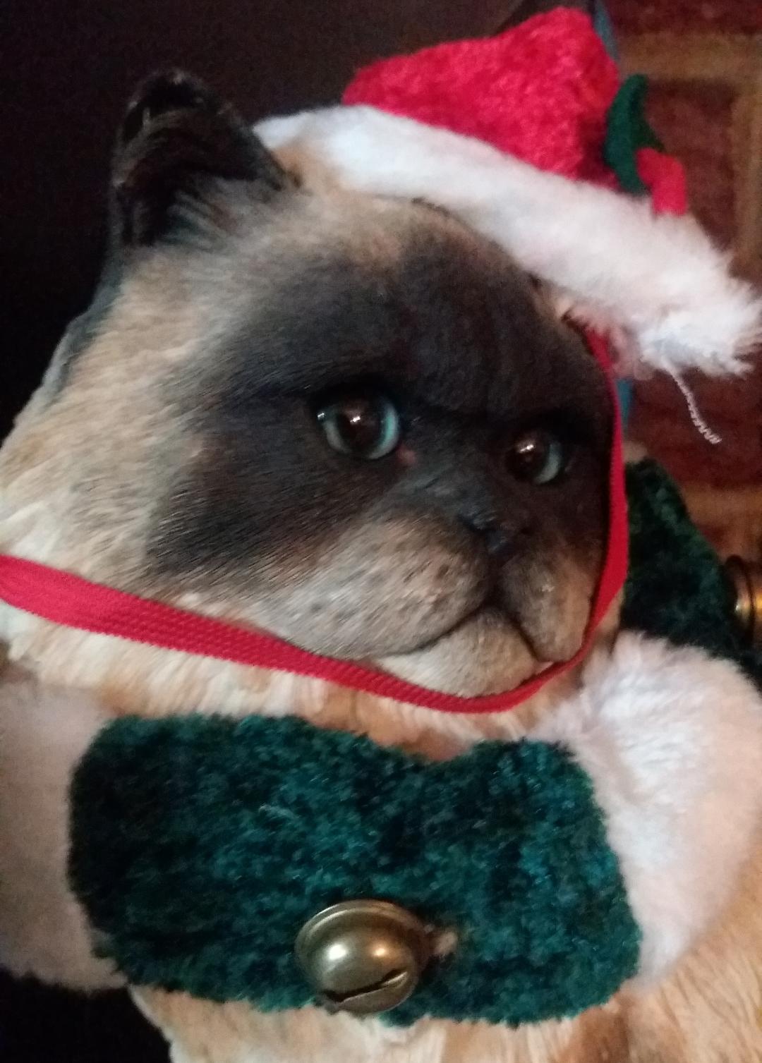 I am finally finished with decorating. These are just a few of my favorites: My kitty nativity My Christmas tree substitute! Thanks, Monroe! Two wooden kitties dressed up in wine bottle covers My fake Persian kitty (cheaper than a real one!)