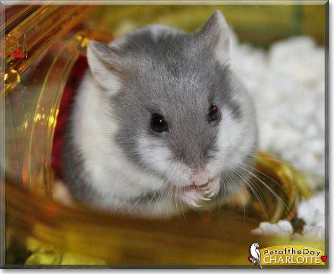 Dearest Charlotte Angel, what a beautiful, precious Dwarf Hamster you are! And what a special, if way too short, time you spent on earth with your dear person and your sister Charlie. You had and have the most delightful personality, always sweet, never biting. You're more easy-going than Charlie, taking it slow and looking at everything. You're very affectionate, and your dear person and Charlie miss you very much. We hope your choice as today's Pet of the Day will help to bring them some comfort as you are celebrated the world around. You and they all love each other very much, don't you. What a wonderful love-filled home you have shared and always will!