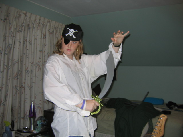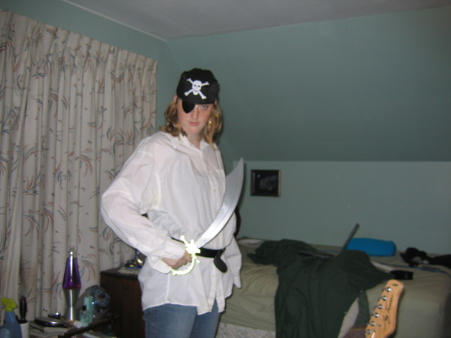 Going to a Halloween party tomorrow night, and the theme is pirates. I went out and bought a bandana/eye patch/ear ring set (cut the hair off the bandana) and got an old shirt of my dad's and put a belt around the waist. (pics posted) You can't see in the pics, but I rolled my jeans up a little (cause I don't have any I can cut)