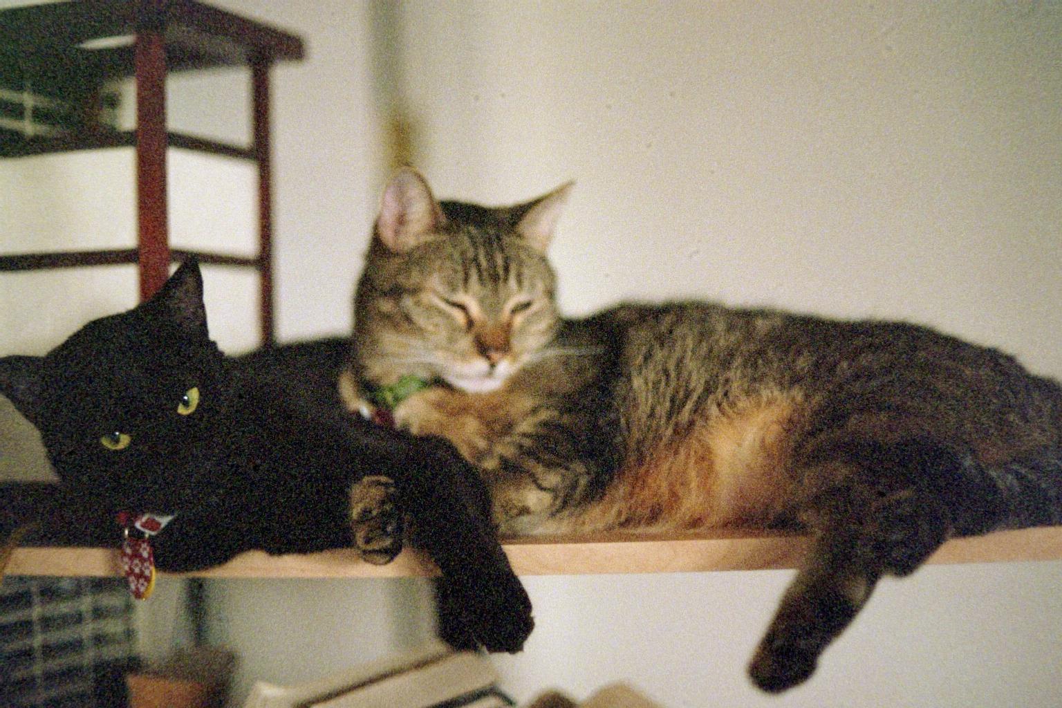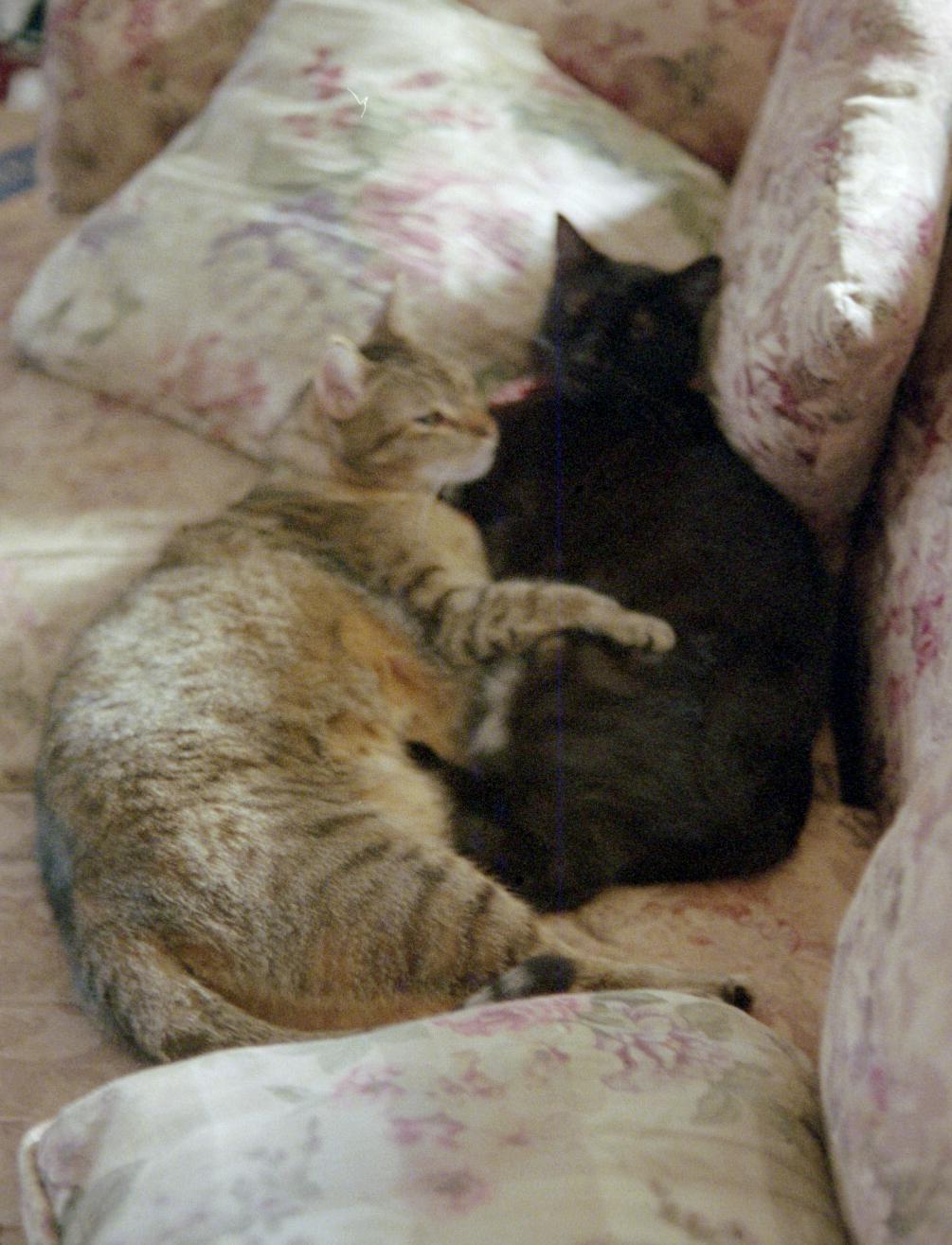Tonight, Don Juan was reclining on the sofa alongside my leg. Zerlina carefully washed the top of his head and his right ear, then fell asleep on top of him. Too cute!