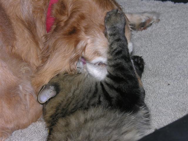 Does anybody have a cat that kneads their dog? My cat is obsessed with my Golden Retriever, constantly kneading him and laying on him. My cat also cleans my dog the same way he cleans himself.