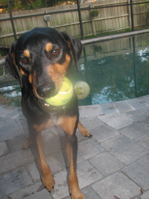You can tell she hasn't ate (which was the first thing I did, fed her a bit of food.) She is much skinnier than before, she has a few red bumps in her ears, her lips are RAW, paws a bit torn, and she has a few prickers that I pulled out. Overall, she looks okay.. no "serious" injuries. First thing she did when I took them outside was grab the tennis ball that I threw in the pool Tuesday among one of my insane moments. Then when she came inside she grabbed the red hand ball (that joined me in many of ym crying sessions) and started playing with it.