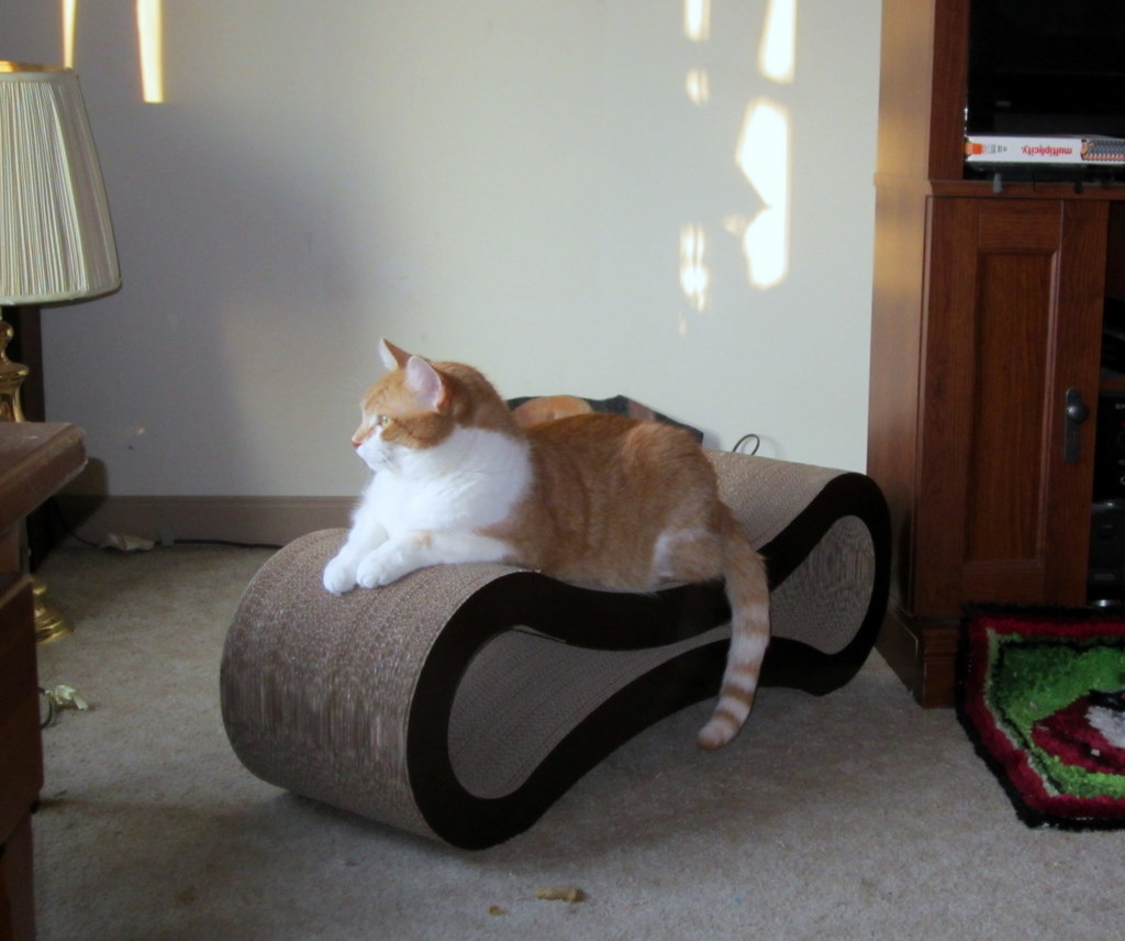 Cool! I got Bean a "scratch Lounge" but it's much smaller (basically, it's a box with a scratching pad on all 3 sides. He sleeps in it....giving "lounge" an extra special meaning but both cats do use it for scratching too.