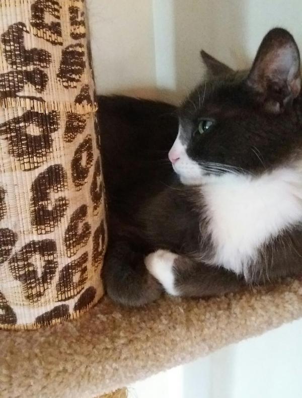 Monroe is currently doing well:). His favorite spot to hang out with us is halfway up the scratch post, he even takes naps up there.