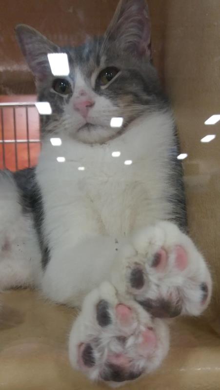 There was this sweet little 6 mo old kitten:love:, pressing his beautiful pink and gray pads against the glass, looking a little sleepy. Nobody with a kitty foot fetish should be able to resist!