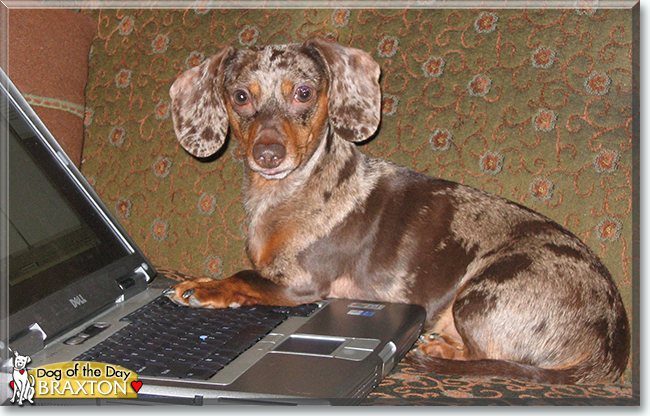 Oh my goodness.. Just look at that face! Those EYES!!! And that beautiful fur! What a gorgeous girl you are, Braxton! You have the most delightful personality, too. You're a very busy Miniature Dachshund, checking out and playing with rubber balls that fit in your mouth, keeping in touch with your friends at DREAM through your laptop, playing with your shaded English cream longhair mini Dach sisters Meah and Emah. You're very sweet and loving. You sleep under the blankets with your dear parents and lick them in return for being rubbed. You love it when mom gives you a massage! You and your dear sisters and parents all love each other very much, don't you. What a wonderful love-filled home you share!