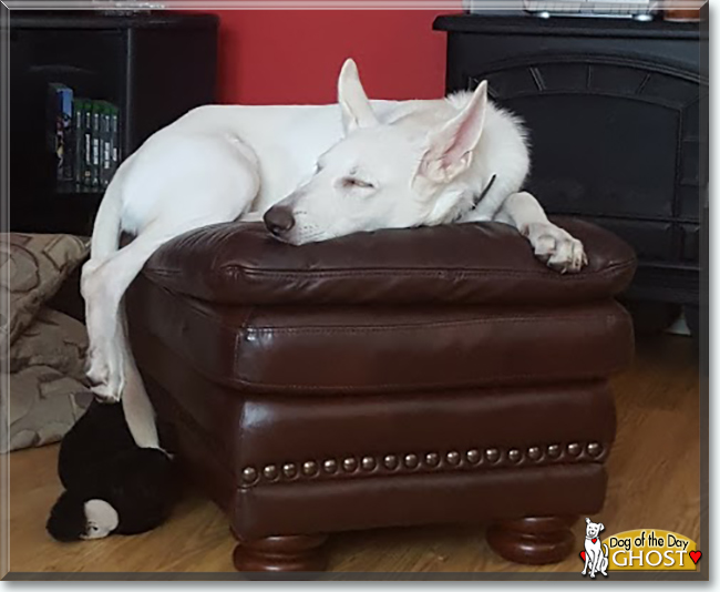 Dearest Ghost, you are absolutely stunning! What a gorgeous white German Shepherd Dog you are, with the sweetest face with so many happy, friendly expressions. Thank you for sharing all those great photos with us! They show your looks and your delightful personality so well. You are full of energy and make your dear people smile with your antics, such as not sitting on chairs correctly, digging up they garden, and repeatedly knocking over your toy box. You are also quite the terrific guard dog, protecting your family from someone who tried to break into your house one night by barking and scaring them away! You and all your family members love each other very much, don't you. What a wonderful love-filled home you share!