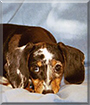 Dearest Tucker, you are adorable indeed, a precious puppy! Your fur coloring is gorgeous. I've never seen any like that on a Dachshund! You are so cute, skootched down there and looking straight out at me. I love that sweet face with those long, silky ears and lovely big brown eyes.