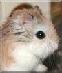 Dearest Robert, what an absolutely precious little fellow you are! You're a dwarf hamster, only as big as a mouse! Your white and gold fur is beautiful and looks so very soft. You have the sweetest face with those lovely big dark eyes. You sleep all day and all night, but you're awake in the mornings and evenings. You live in a cage with your little house to sleep in and your hamster wheel and wooden bridge. Your dear young friend likes your funny nose and your curiosity and is always glad to see you. You and he/she love each other very much, don't you. What a wonderful love-filled home you share!