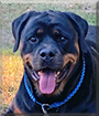 Dearest Fiona, a.k.a. Fifi, what a fabulous Rottweiler lady you are! That brown and black coat is gorgeous, and just look at that sweet, sweet face! What a delight to see you gazing straight out at me with those lovely big dark eyes, your mouth open in what certainly looks like a big smile (and probably is!). Then we see you standing up so handsome, and then crashed out on your back snoozing in your special spot on the couch. You have the most delightful personality, too! You have great fun outdoors, playing and walking and laying in the sun, warming your coat. You protect your "human siblings" as if they were your actual siblings. You enjoy pillow fights and tickle fights and baths and snuggling. You are a very good dog, "soft and lovable and huggable!" You and your family members all love each other very much, don't you. What a wonderful love-filled home you share!