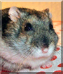 Dearest Krümel, what an adorable Hungarian Dwarf Hamster you are, so pretty with your colorful soft-looking coat and little pink nose and long black whiskers and lovely big dark eyes. You have such a delightful personality, too. You warmed up to your dear new person the very day he/she first brought you home! You're very calm and trusting. You let people pet you, and you don't get scared. You're also quite a climber. One day you broke out of your cage atop a high bureau and climbed down four bookshelves. Then you sat in front of the bathroom door, where you waited for your person to pick you up and bring you back to your cage. What a clever fellow you are! You and your person love each other very much, don't you. What a wonderful love-filled home you share!